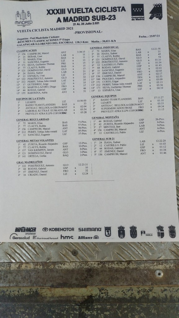 Marcel Camprubi (Antiga Casa) ha sido el ganador de la quinta y última etapa de la Vuelta Ciclista a Madrid disputada entre el Velódromo de Galapagar y San Lorenzo del Escorial, de 138,3 kilómetros de recorrido. Espectacular final en el durísimo muro de San Lorenzo. Elías Maris (Basso Team) es el ganador final de la carrera. Eugenio Sánchez (Lizarte) ha terminado cuarto en la jornada final tras un último kilómetro sensacional. En la general ha terminado octavo.