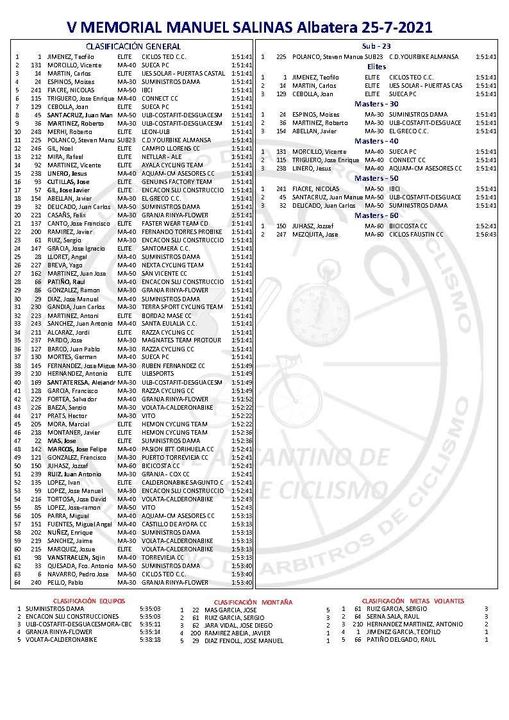 Teófilo Jiménez (Ciclos Teo) se ha impuesto hoy al esprint en el IV Memorial Manuel Salinas disputado en Albatera sobre una distancia de 79 kilómetros. El ganador de la sexta prueba puntuable del Interclub Vega Baja ha hecho un tiempo de una hora, 51 minutos y 41 segundos. Vicente Morcillo (Sueca PC) ha sido segundo y Carlos Martin (Ijes Solar), tercero. Raúl Patiño (Encancon) sigue de líder, con Sergio Ruiz (Encancon), segundo y Joan Cebolla (Sueca), tercero. Teófilo Jiménez ha sido el primer élite; Moisés Espinós se ha impuesto en M30; Vicente Morcillo, en M40; Nicolás Fiacre (IBCI), en M50; Steven Manuel Polanco (Yourbike), en sub 23; y Jozsep Juhasz (Bicicosta), en M60. Por equipos, el Suministros Dama ha subido a lo más alto del podio; José Más (Suministros Dama) se adjudicó el Premio de la Montaña; y Sergio Ruiz (Encancón), las metas volantes.