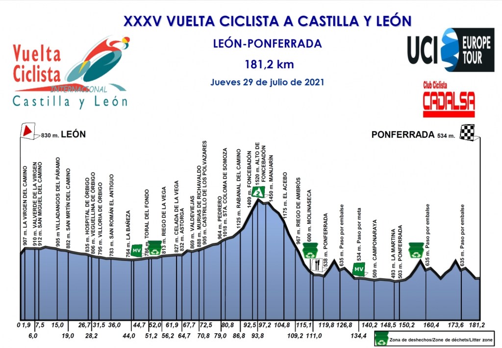 Un primer paso por línea de meta (kilómetro 134), ubicada frente al Hotel Ciudad de Ponferrada, servirá como segunda meta volante de la jornada antes de afrontar la última parte de la carrera, para conocer al sucesor de Davide Cimolai (Israel Cycling Academy) como vigente ganador.