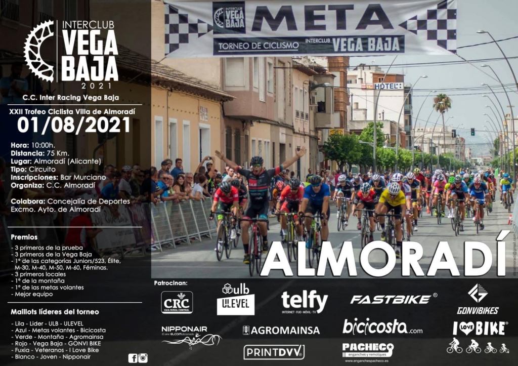 El domingo, 1 de agosto, se disputa, a partir de las 10 horas, la séptima prueba del Torneo Interclub Vega Baja, el XXII Trofeo Villa de Almoradí. El club local ha diseñado un circuito de 2,5 kilómetros, que parte del Bar Murciano y recorre las avenidas de Manuel de Torres, Algorfa, Comunitat Valenciana y Orihuela. Serán 30 vueltas hasta llegar a los 75 kilómetros.