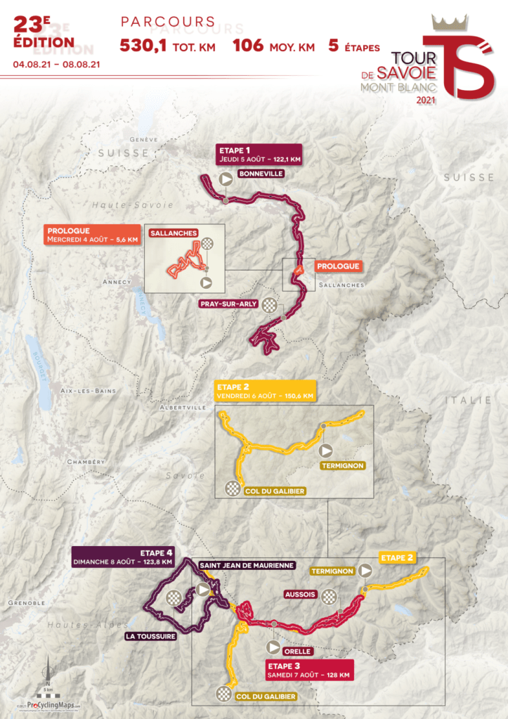 La prueba se inicia el 4 de agosto en Sallanches con una prólogo con 5,6 kilómetros y finaliza el domingo en La Toussuire