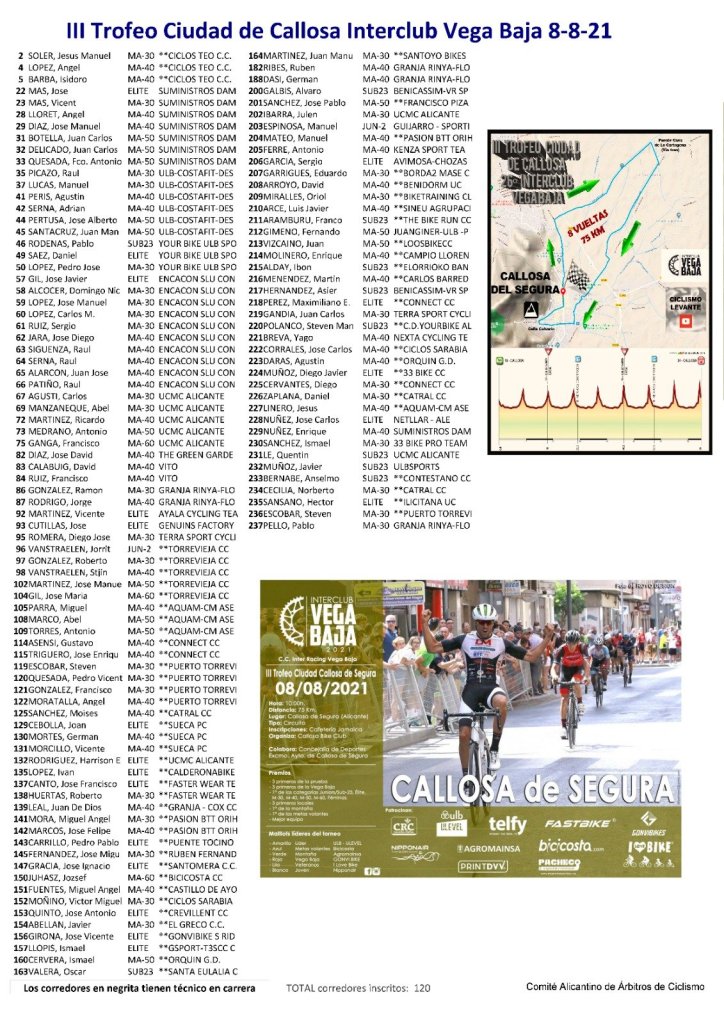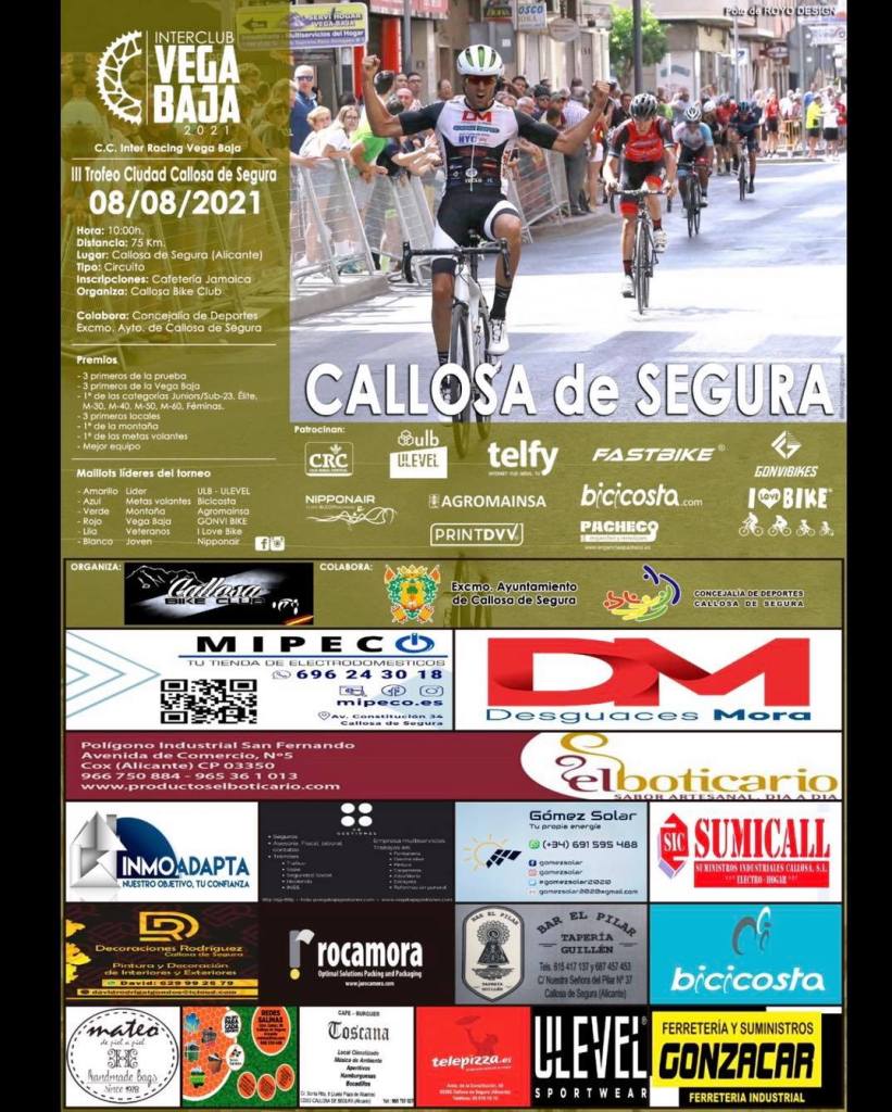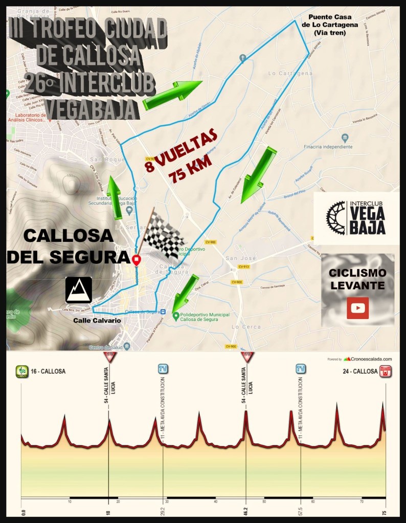 El domingo, 8 de agosto, se corre, a partir de las 10 horas, la octava y última prueba del Torneo Interclub Vega Baja, el III Trofeo Ciudad de Callosa del Segura. El club local ha diseñado un circuito de 9,29 kilómetros, con salida y meta en la Avenida de la Constitución. Serán ocho vueltas hasta llegar a los 75 kilómetros. Existe un desnivel acumulado de 400 metros. En la calle Calvario los líderes deberán estar atentos ya que es un paso estrecho, corto y empinado.