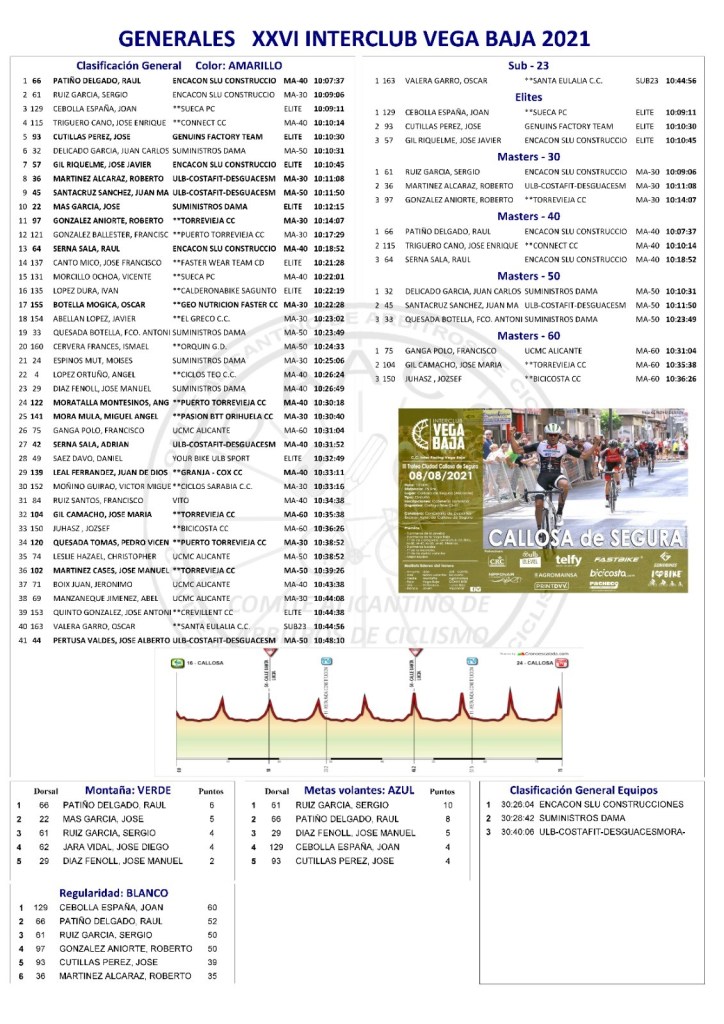 Raúl Patiño (Encancon) es el líder de la general y de la categoría M40; Sergio Ruiz comanda la clasificación de los M30; Joan Cebolla (Sueca), de los élites; Juan Carlos Delicado (Suministros Dama), de los M50; Francisco Ganga (UCMC), de los M60. El Encacon es el líder de la clasificación por equipos; Raúl Patiño el maillot de la montaña; Sergio Ruiz, el de las metas volantes; y Joan Cebolla, el de la Regularidad.