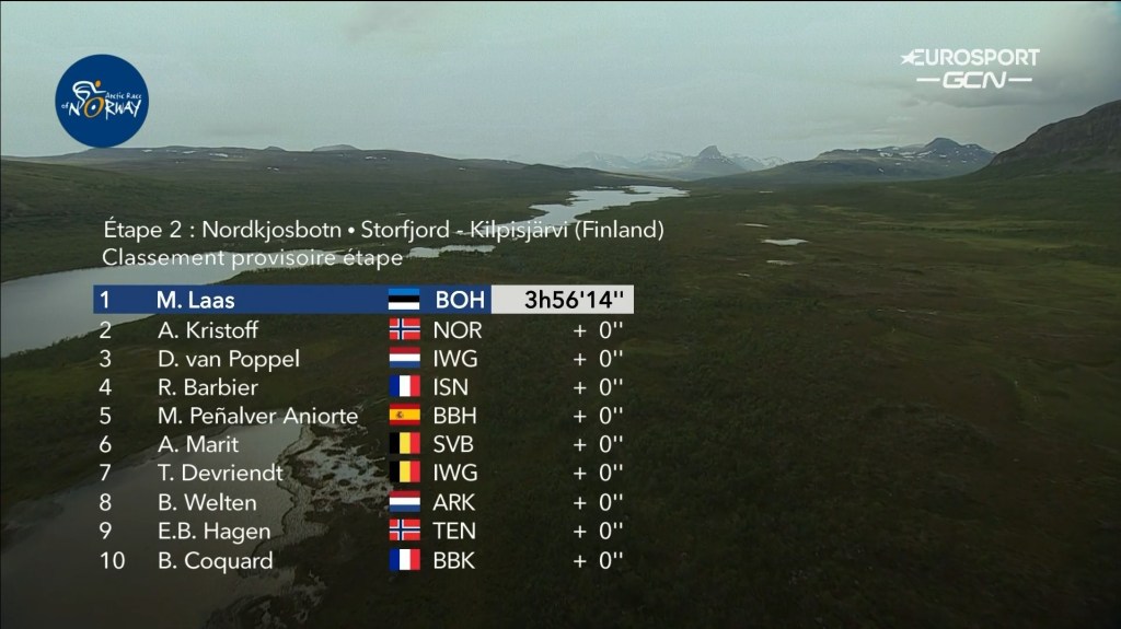 Martin Laas (Bora-Hansgrobe) ha sido el ganador al esprint de la segunda etapa de la Arctic Race of Normay que ha llevado al pelotón Kilpisjarvi tras 177,6 kilómetros. Ha hecho un tiempo de tres horas, 56 minutos y 14 segundos. Alexander Kristoff (Norway) ha sido segundo y es el nuevo líder. Manuel Peñalver (Burgos BH) ha firmado un quinto puesto y Felipe Orts ha terminado en el grupo tras realizar un gran trabajo de equipo. «Me he encontrado muy bien de piernas en el esprint», confesaba el torrevejense antes de agradecer «el pedazo de trabajo que ha hecho el equipo, haciendo un gran treno y luchando por la posición. Mil gracias compañeros por el esfuerzo y la confianza, el quinto puesto en vuestro».