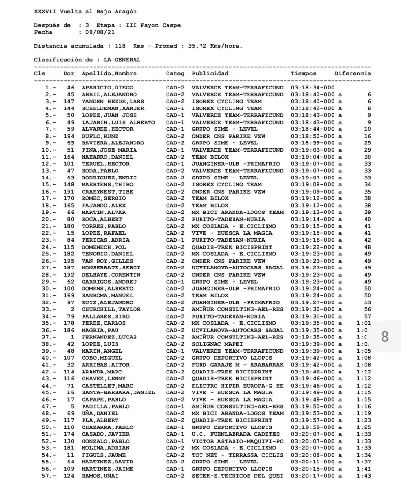 Hoy se disputa la cuarta y última etapa de la XXXVII Vuelta al Bajo Aragón para corredores cadetes que tendrá salida y meta en Caspe y 56 kilómetros de recorrido. La salida está previsto a las 17 horas. El benidormense Héctor Álvarez fue el ganador de la etapa del domingo, ayer hubo descanso, en el duro ascenso al Alto del Castillo de la Ciudad del Compromiso, y logró el maillot de la regularidad. Álvarez se encuentra a diez segundos de líder, el corredor del Valverde Team, Diego Aparicio, y va a tratar de asaltar el primer puesto. «”Lo vamos a intentar”, afirma el corredor del Grupo Sime, que también cuenta con la baza de Alejandro Baviera, en el puesto noveno de la general, a 25 segundos del amarillo. También tienen ganas de guerra los componentes del GD Llopis. La batalla está asegurada y las espadas están en todo lo alto.