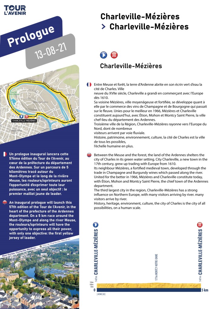 Hoy arranca el Tour de Porvenir con un prólogo contra el crono de 5 kilómetros con salida en Charleville y final en Mézières. En esta primera parte de la prueba el pelotón también deberá afrontar una contrarreloj por equipos y varias jornadas nerviosas, de perfil quebrado y con posibles llegadas al sprint. Luego llegará la montaña, que será la gran protagonista en las etapas sexta, séptima, octava y novena, sobre todo en las tres últimas, con finales en el Grand Colombier, en Sant Jean d’Arves previo ascenso al Glandon y en el Col du Petit Saint-Bernard tras ascender el Iseran.