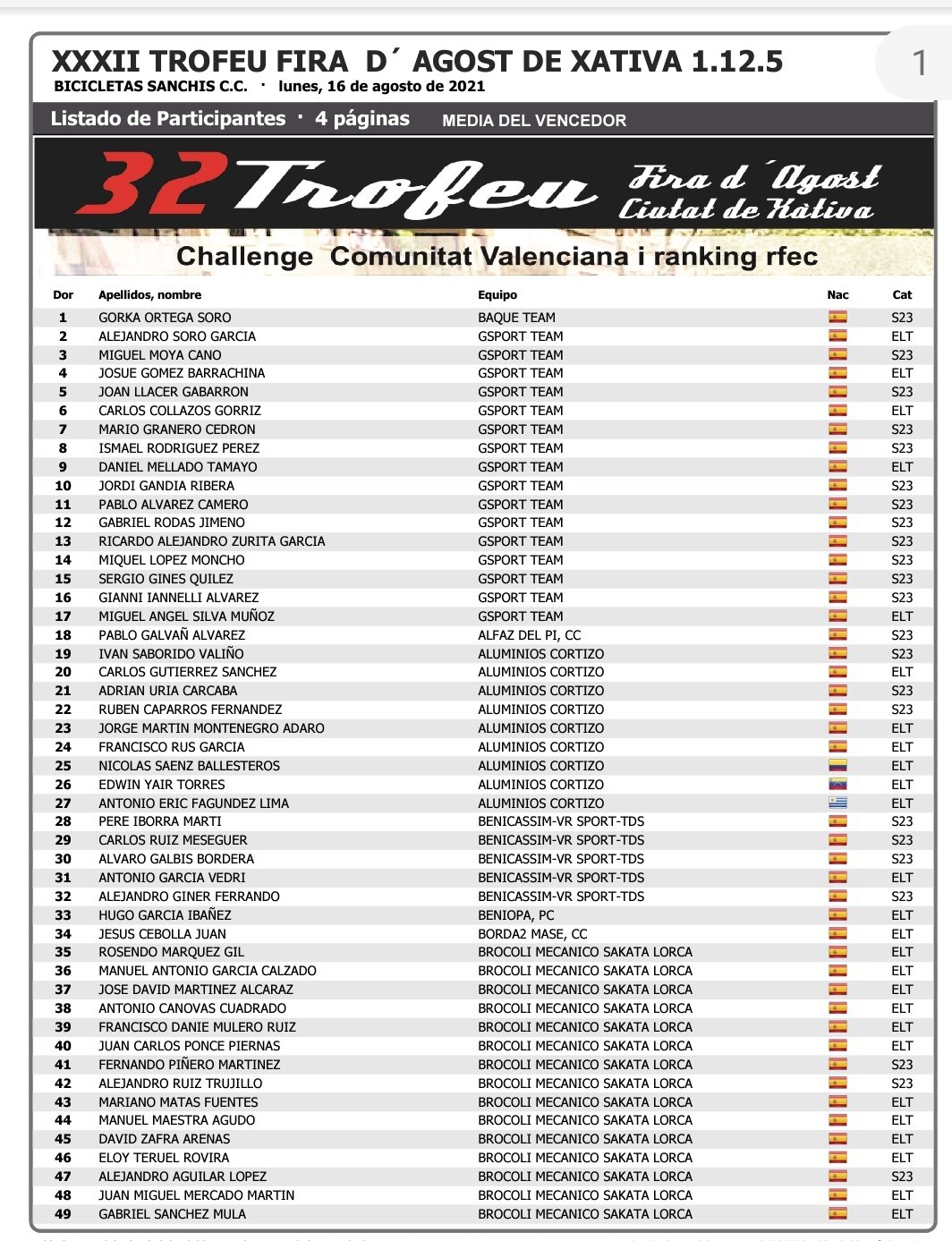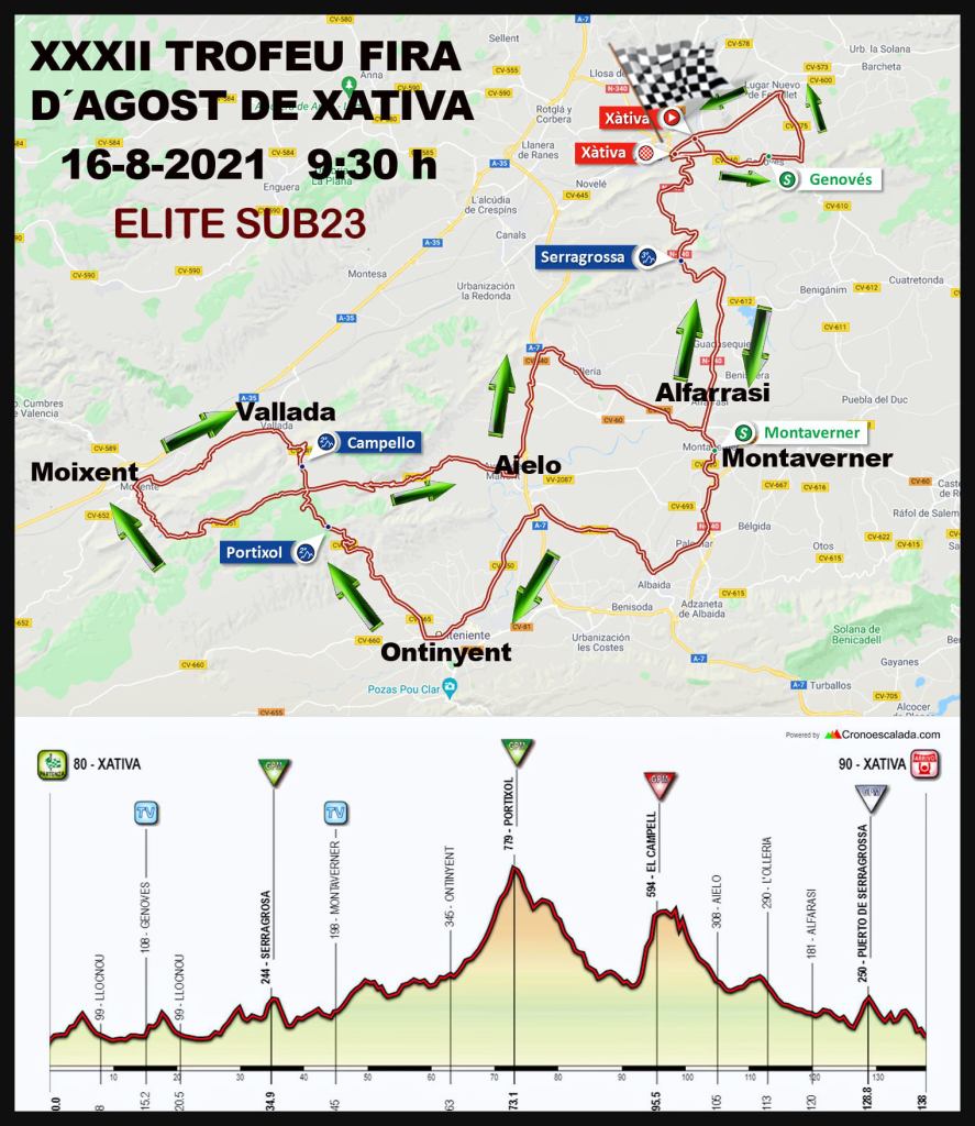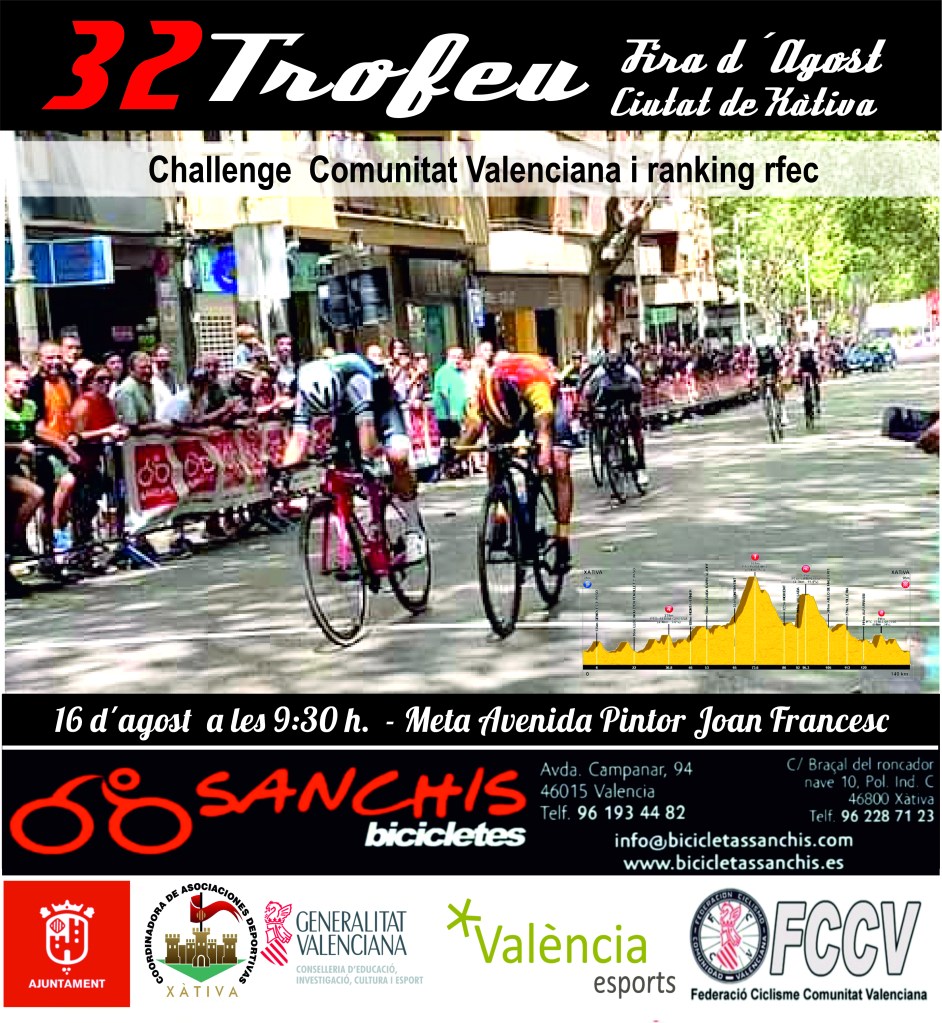 El lunes, 16 de agosto, se disputa el XXXII Trofeu Fira d’Agost “Ciutat de Xátiva”. La prueba, organizada por el Club Ciclista Bicicletas Sanchis, cuenta con 138 kilómetros de recorrido y con nada menos que 1.700 metros de elevación y los puertos de Serragosa, Portixol y Campello en el recorrido. El banderazo inicial se dará las 9.30 horas y en línea de salida estarán los equipos Netllar Ále y Essax.