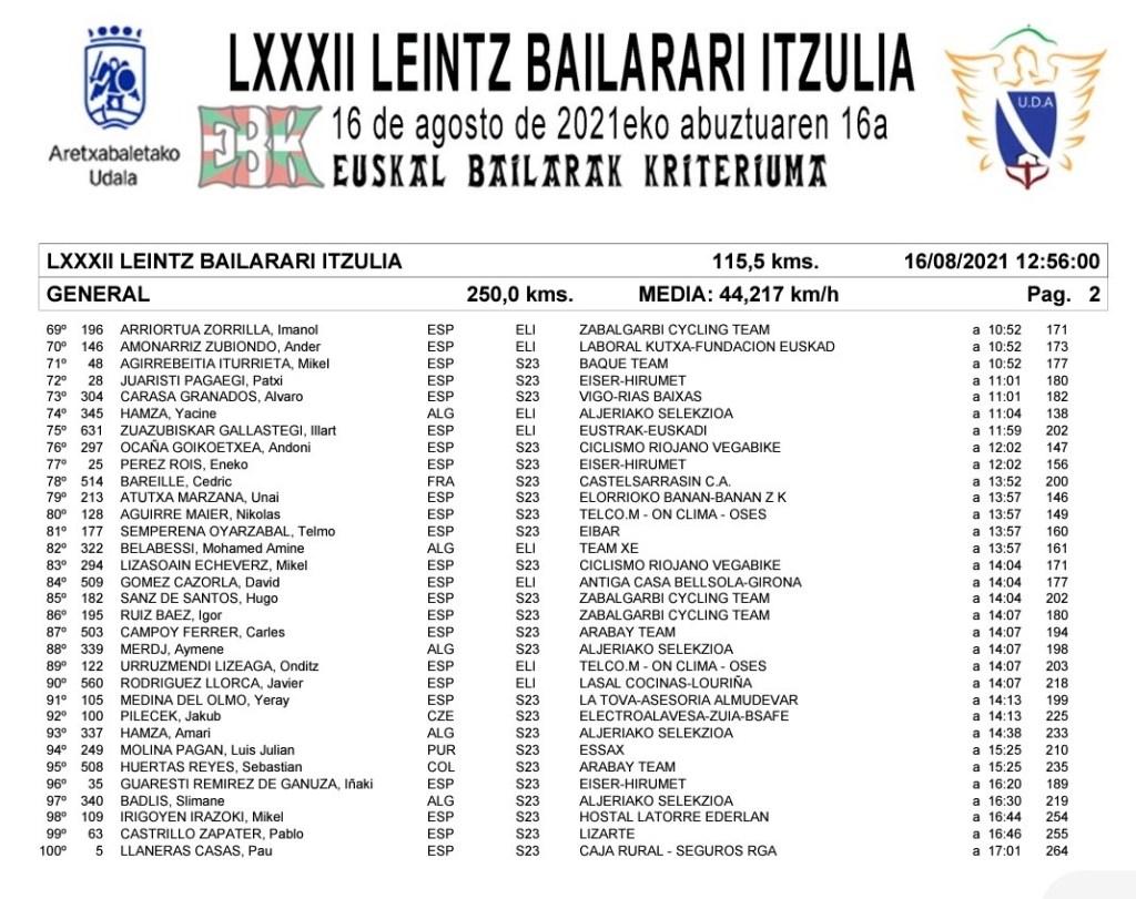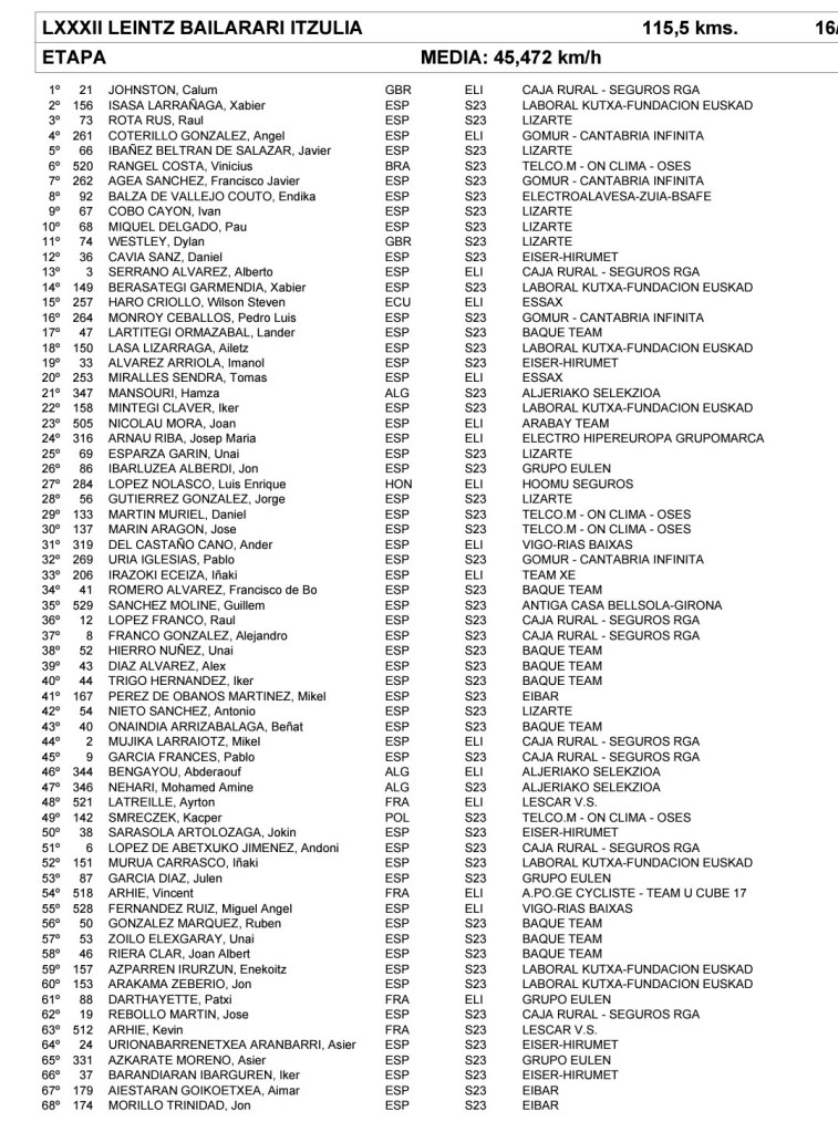 Calum Johnston (Filial Caja Rural) ha sido el ganador de la segunda jornada de la Euskal Bailarak Kriteriuma disputada en Aretxabaleta. El vencedor ha recorrido los 115 kilómetros de la Leintz Bailari Itzulia y se ha impuesto en la línea de meta a Xabier Isasa (Laboral Kutxa). El británico lidera la general. Raúl Rota (Lizarte) ha completado hoy el podio. Top 20 para el equipo Essax. Steven Haro ha ocupado el puesto 15 y Tomás Miralles el 20. En la general están situados en los puestos 9 y 10, respectivamente. Mañana prometen batalla en Llodio.