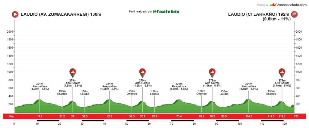 El martes se disputa en Llodio la última etapa de la Euskal Bailarak Kriteriuma. El XXXI LAUDIO SARIA cuenta con 133 kilómetros repartidos en un circuito de 33 kilómetros al que darán cuatro vueltas, teniendo su punto caliente en la subida al alto de Garate. La última de se coronará a algo menos de 6 kilómetros de meta. Además, la meta está situada en un durísimo repecho final de apenas 600 metros al 11%.