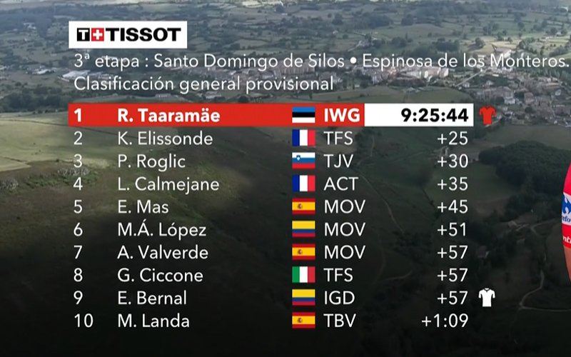 El estonio Rein Taaramäe (Intermarché-Wanty-Gobert Matériaux) tocó la gloria en el Picón Blanco al ser el más fuerte de los escapados para anotarse su segunda victoria en La Vuelta diez años después de ganar en La Farrapona, que entonces se subía también por vez primera en la carrera. No sólo se llevó un triunfo de prestigio sino que además se enfundó La Roja como nuevo líder de la carrera con 25” sobre Kenny Elissonde (Trek-Segafredo), otro de los protagonistas del día, y 30” sobre Primoz Roglic (Jumbo-Visma).