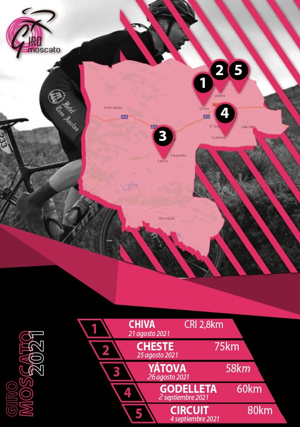Con un prólogo de 2,8 kilómetros en la modalidad de contrarreloj individual y una ascensión en Chiva a la ermita de la Virgen del Castillo (1km al 8,8%) se iniciará el sábado, 21 de agosto, el denominado Giro Moscato. Un “nombre icónico” para esta nueva carrera por etapas, que organiza el Club Deportivo Montiz, y que a su juicio “nace de la mezcla entre ciclismo y agricultura, oficio ancestral y que a día de hoy, sigue como predominante en nuestra comarca, la Hoya de Buñol”. La prueba está abierta a todos los corredores y corredoras de las categorías júnior, sub 23, élites y Máster 30, 40, 50 y 60.