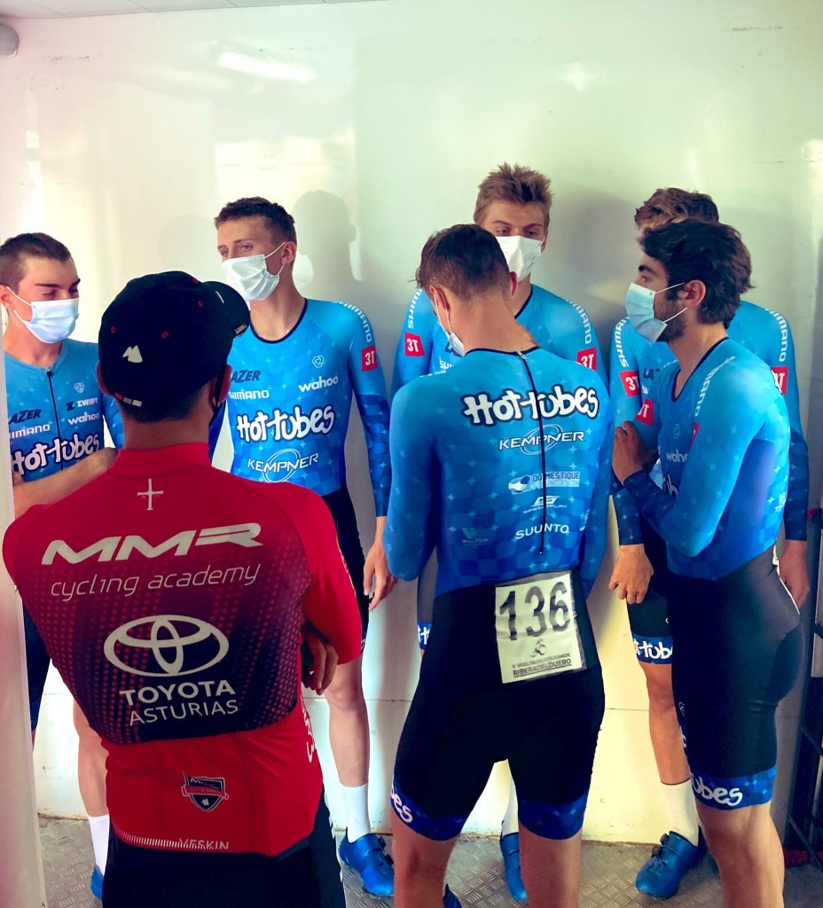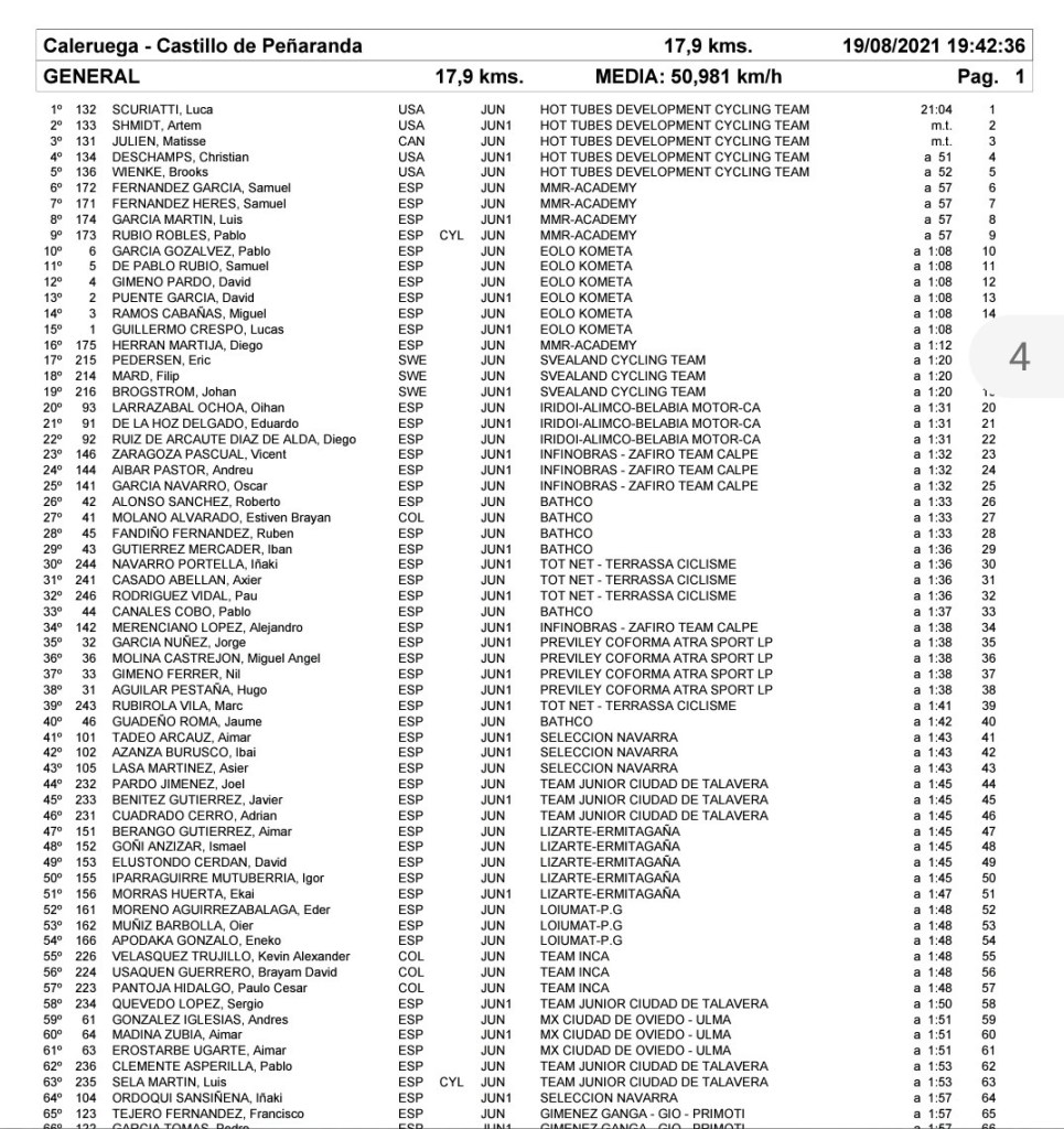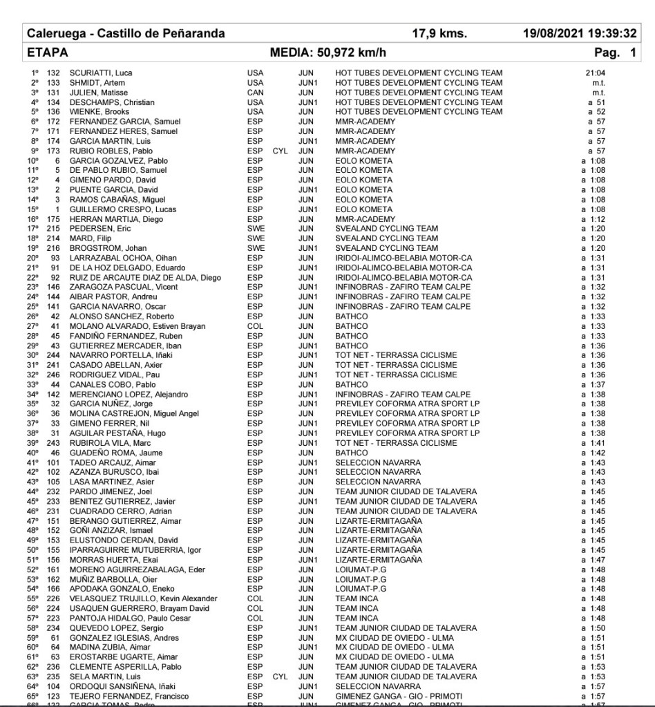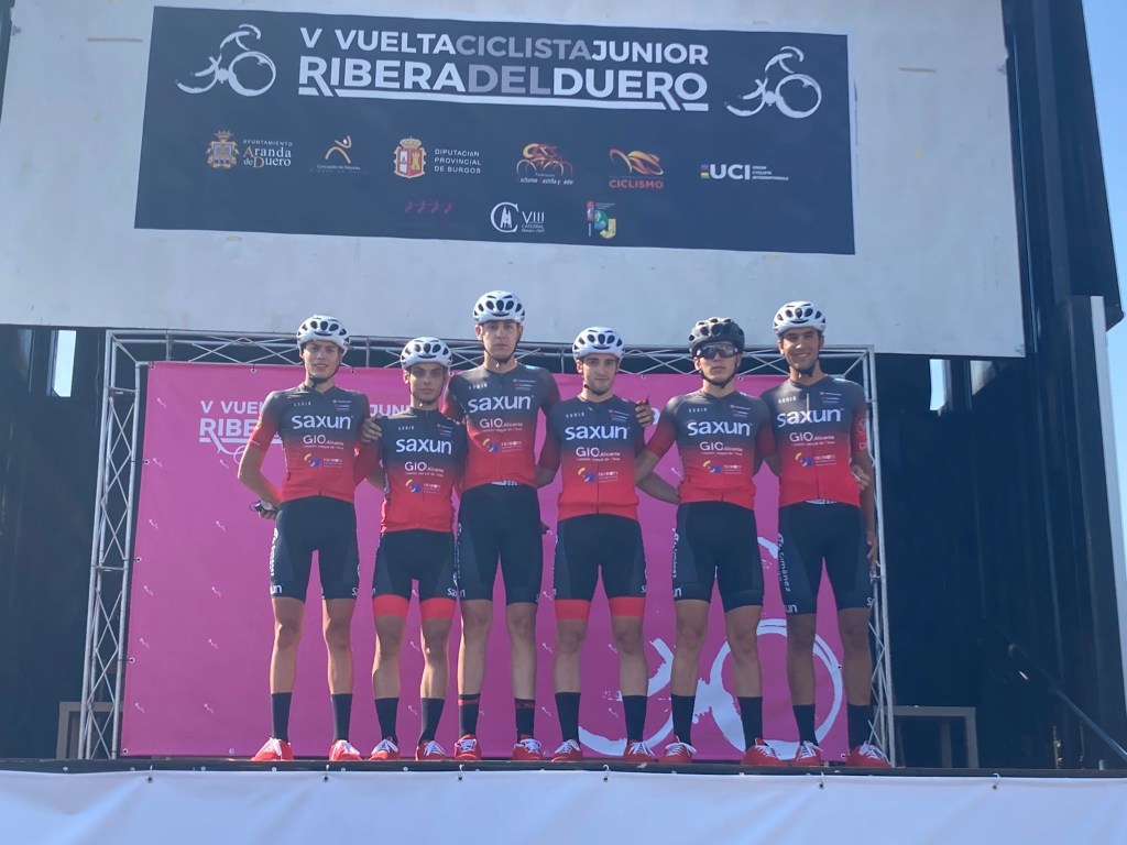 El equipo estadounidense Hot Tubes se ha impuesto esta tarde en la primera etapa de la Vuelta a la Ribera para corredores júnior disputada en la modalidad de contrarreloj por equipos con salida en Caleruega y final en Castillo de Peñaranda. Tras 17,9 kilómetros de pedaleo han hecho un tiempo de 21 minutos y cuatro segundos. El MMR Academy, 22:01, ha sido segundo, y el Eolo Kometa Team, 22.12, tercero. La sexta plaza ha sido para el Infinobras Calpe ( Aarón Merenciano, Óscar García, Alejandro Merenciano, Antonio Luis Soler, Andreu Aibar y Vicent Zaragoza) y el puesto 16 para el Giménez Ganga Gio Alicante Primoti (Adrián Moncho, Gonzalo Albir, Pedro García, Adán Bortolazzi, Jorge Beldrán y Francisco Tejero).