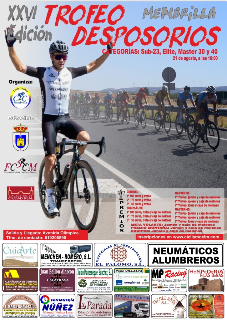 El Club Ciclista Membrilla retoma el sábado, 21 de agosto, la organización de su Trofeo Desposorios que este año celebra su edición 26, enmarcado de nuevo en las fiestas patronales de la localidad ciudadrealeña. El Trofeo está dirigido a las categorías Élite, Sub 23, Máster 30 y Máster 40. La organización espera una participación de 200 ciclistas. Estará Luis Moltó (Tenerife) además de otros corredores máster como José Carlos Núñez, Ángel Lloret, José Diego Jara, Pedro José López o Mario García. La carrera, de 116 kilómetros, arrancará a las 10 de la mañana.