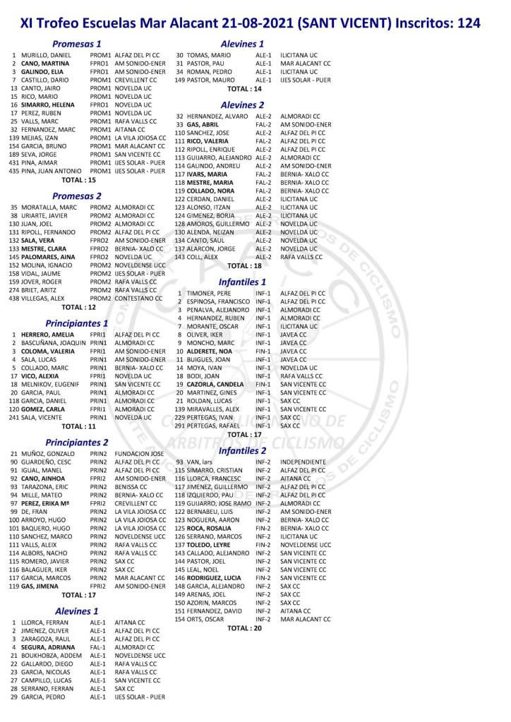 El sábado se disputa en San Vicente del Raspeig el XI Trofeo de Escuelas de Ciclismo Mar Alacant con la presencia de 125 ciclistas pertenecientes a veinte clubes. La competición comenzará a las 18 horas y está destinada a las categorías Promesas Masculino 2, Promesas Masculino 1, Promesas Femenino 2, Promesas Femenino 1, Principiantes Masculino 2, Principiantes Masculino 1, Principiantes Femenino 2, Principiantes Femenino 1, Infantil Masculino 2, Infantil Masculino 1, Infantil Femenino 2, Infantil Femenino 1, Cadete Fem., Alevín Masculino 2, Alevín Masculino 1, Alevín Femenino 2, Alevín Femenino 1 y Adaptado. La organización, el Club Ciclista Mar Alacant, ha diseñado un circuito de en Polígono Canastel y la salida y meta está situada en el calle Martillo.