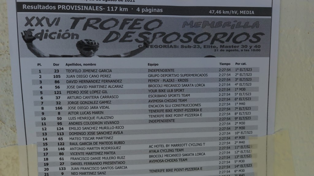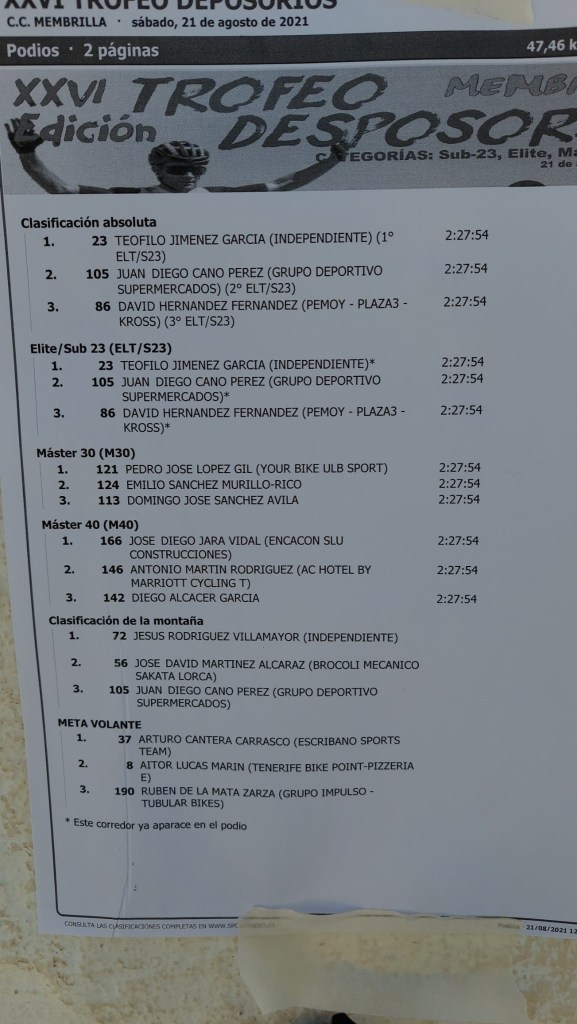 Teófilo Jiménez (Ciclos) se ha impuesto hoy al esprint en el XXVI Trofeo Desposorios que se ha disputado en Membrilla. El Trofeo, dirigido a las categorías Élite, Sub 23, Máster 30 y Máster 40, se ha disputado sobre 117 kilómetros. El ganador ha hecho un tiempo de dos horas, 27 minutos y 54 segundos. Le han acompañado en el podio Juan Diego Cano (Superfroiz) y David Hernández (Pemoy).