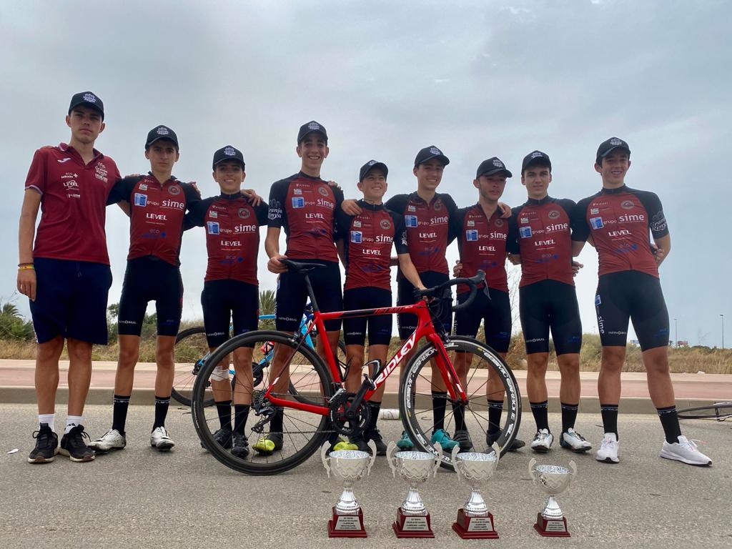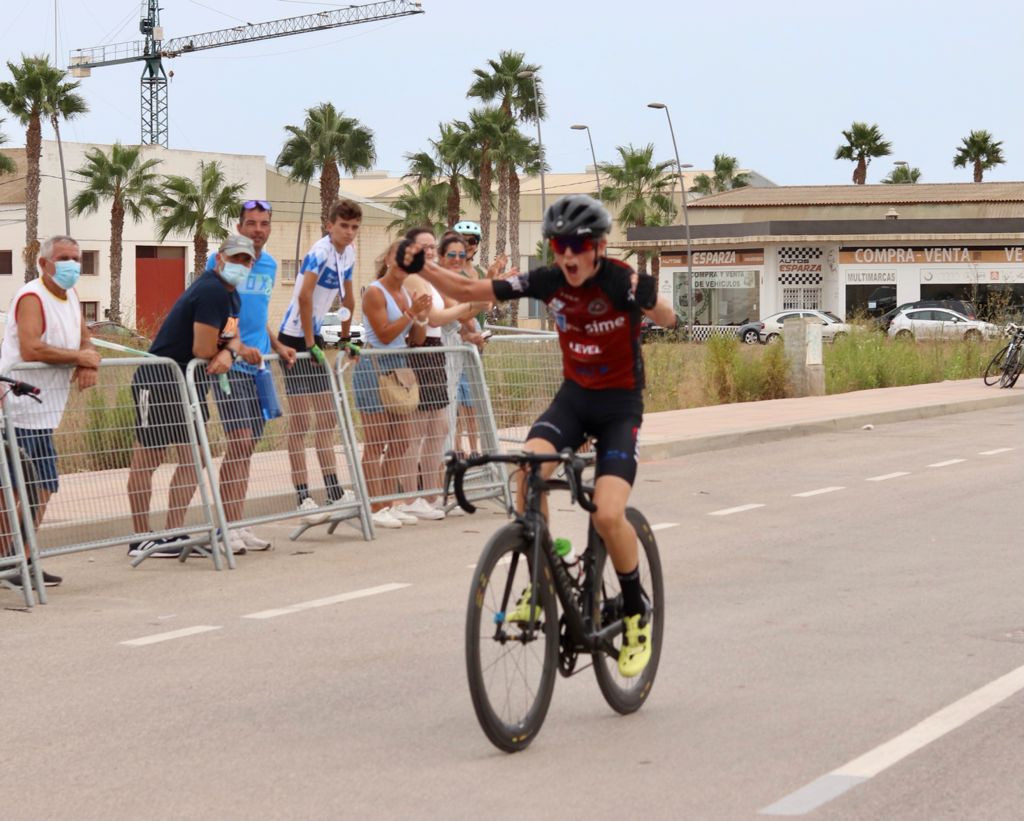 Hugo Ortuño (Grupo Sime) se ha impuesto esta mañana en el XIV Trofeo Escuelas y cadetes disputada en Los Alcázares. Ortuño ha atacado a tres vueltas y ha entrado en solitario en meta tras parar el reloj en la hora, 10 minutos y 41 segundos. A quince segundos ha accedido de meta su compañero de equipo Mario Álvarez, mientras que la tercera plaza la ha ocupado Pablo Roda (Valverde Team). Hugo Ortuño ha ganado el premio de las metas volantes y el Grupo Sime ha sido el mejor equipo. «Tengo que agradecer el trabajo del equipo. Cuando he atacado, nadie tiraba y mi compañero Mario ha controlado y he podido llegar solo a meta», comentaba el corredor oriolano.