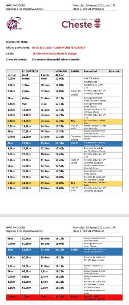 El día 25 de agosto, a partir de las 17 horas, se disputará la segunda etapa del Giro Moscato. Tendrá salida y meta en Cheste y 75 kilómetros de recorrido. La nueva prueba está abierta a todos los corredores y corredoras de las categorías júnior, sub 23, élites y Máster 30, 40, 50 y 60 y el día 25 agosto se disputará la segunda etapa en Cheste, con una distancia de 75 kilómetros.