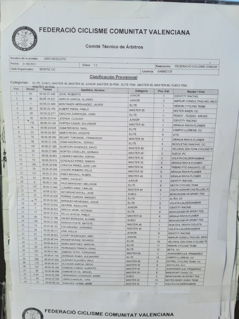 Roberts paró el reloj del prólogo inaugural del Giro Moscato en 5:07’ tras finalizar la subida. En primer élite en la etapa fue Javier Montaner; Pablo Albert Piera (Mister Biker) se impuso en M30; Salvador Fortea (Granja Rinya), en M40; Fernando Gimeno (Juan Giner), en M50; José Saturnino (Benicasim), en sub 23; y Alicia Crespo en féminas.