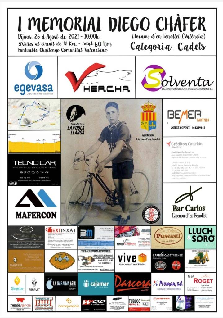 El jueves, día 26 de agosto, se disputa en Llocnou d’en Fenollet, la primera edición del Memorial Diego Chàfer. La prueba, que en principio estaba destinada a los corredores juveniles, será para cadetes y perteneciente a la Challenge de la Comunitat. La salida esta prevista a las 10 y los corredores deberán hacer 60 kilómetros. Deberá dar cinco vueltas a un circuito de 12 kilómetros. En la línea de salida estarán todos los equipos masculinos cadetes de Alicante, además del Cronobike Granja Rinya femenino, con Laura Guardeño, Ana Rocío Alfonzo, Rut Martínez y Aida Rossato, y de Claudia Xiangfe, con el maillot del GD Llopis. La organización de la carrera es del CC La Pobla Larga.