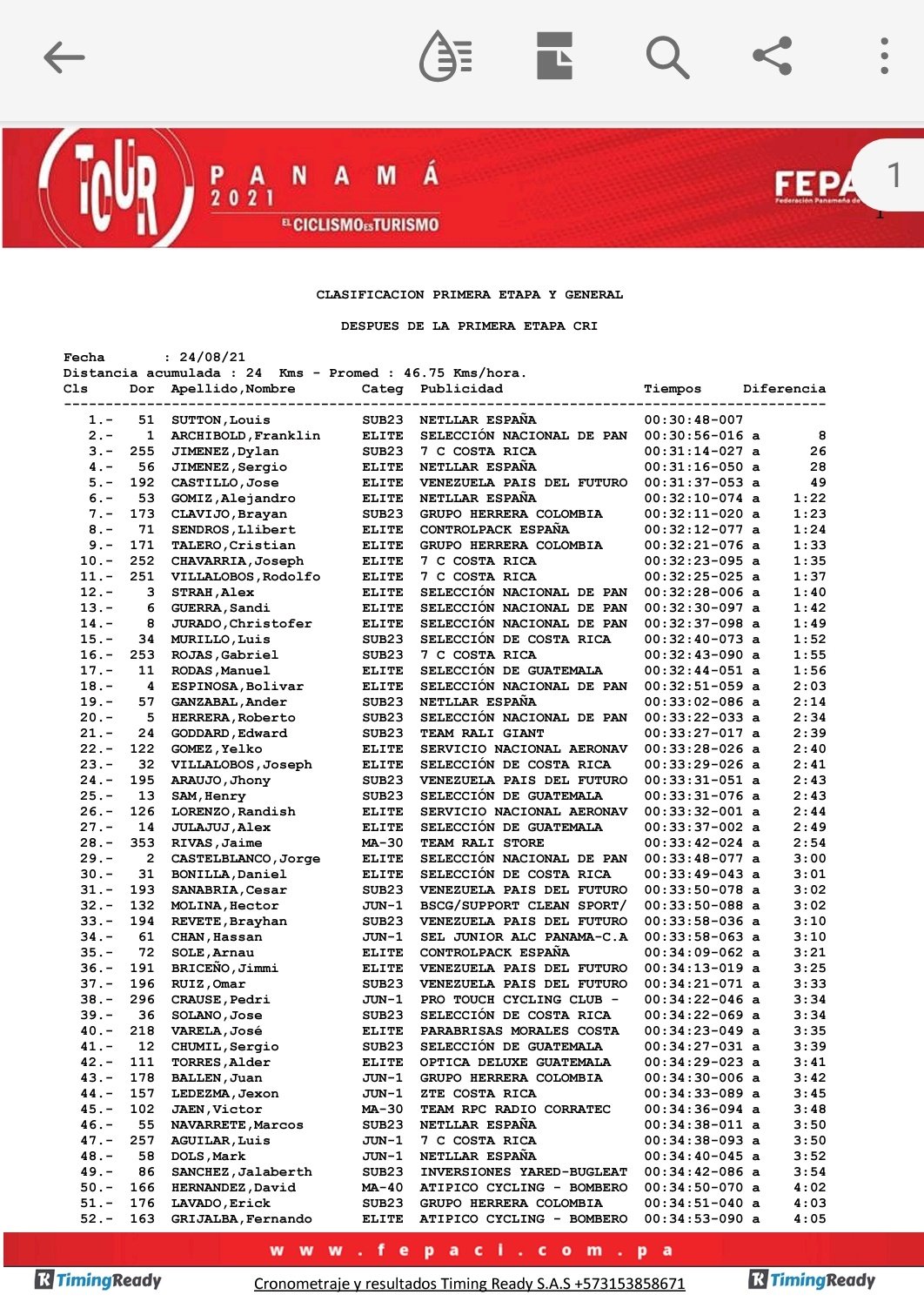La primera en la diana. Louis Sutton (Netllar Alé) acaba de lograr la victoria en la primera jornada de la Vuelta Ciclista a Panamá. El británico ha sido el mejor en una contrarreloj individual de 24,4 kilómetros, en principio estaban previstos 31,86, que se ha disputado entre el Parque de Tonosí y la Playa Venao y se ha vestido con el maillot de líder. Ha parado el reloj en 30:48-007. A ocho segundos ha terminado Franklin Archibold (Panamá) y a 26, Dylan Jiménez (Costa Rica).