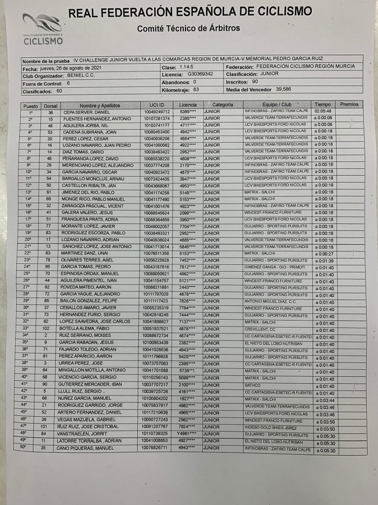 Cepa ha hecho un tiempo de dos horas, cinco minutos y 48 segundos. Antonio Fuentes (Valverde) ha entrado a continuación a ocho segundos y Nil Aguilera (Bikesport). Joan Cadena (Bikesport) ha llegado a 18 dando tiempo al pelotón.