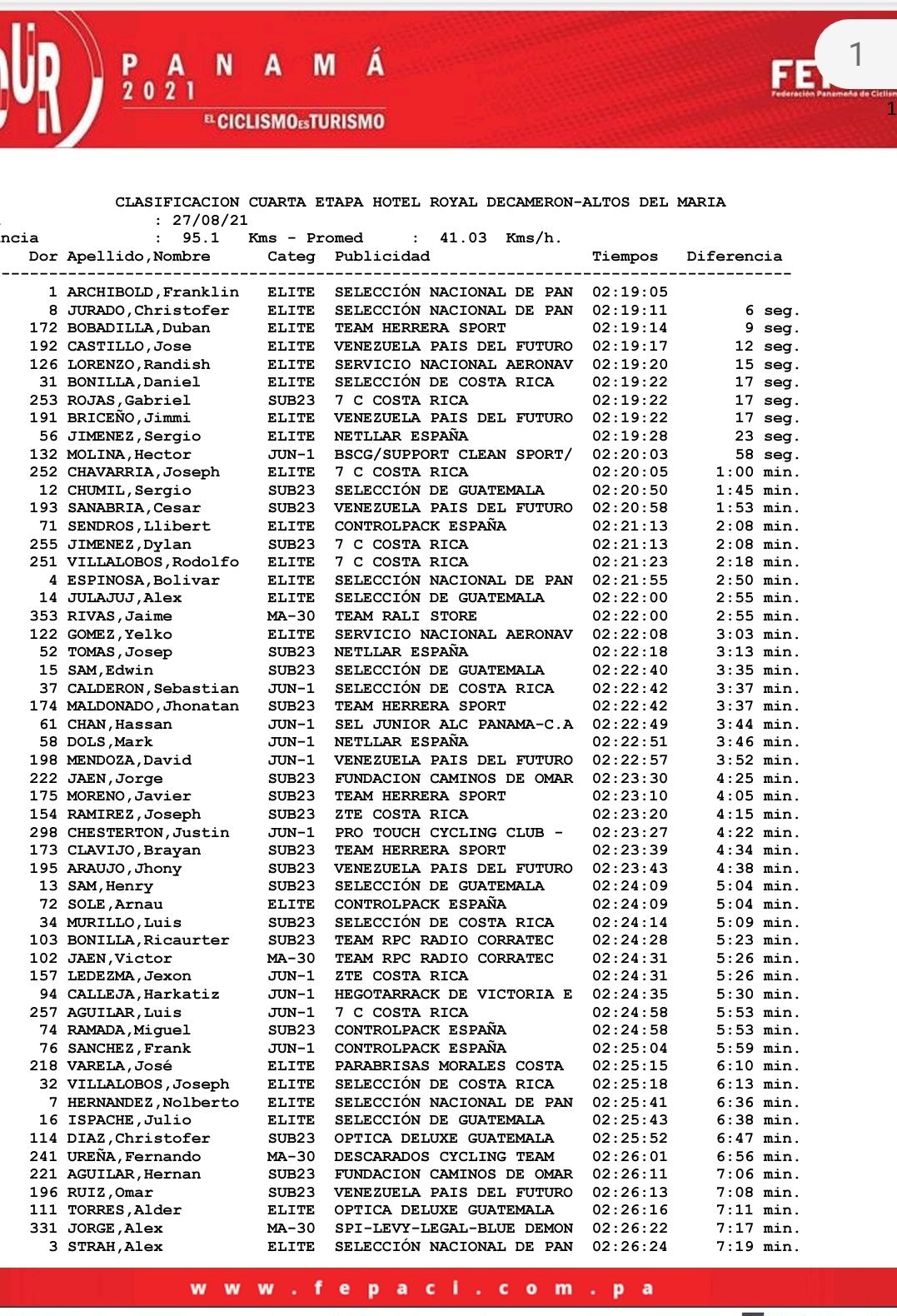 Franklin Archibold ha sido el ganador de la cuarta etapa de la Vuelta a Panamá que ha llevado al pelotón de Penonomé a los Altos del María, tras 95.24 kilómetros de recorrido. Tercera victoria consecutiva del corredor panameño. Impresionante el trabajo de Franklin Archibold y de toda la selección nacional de Panamá.