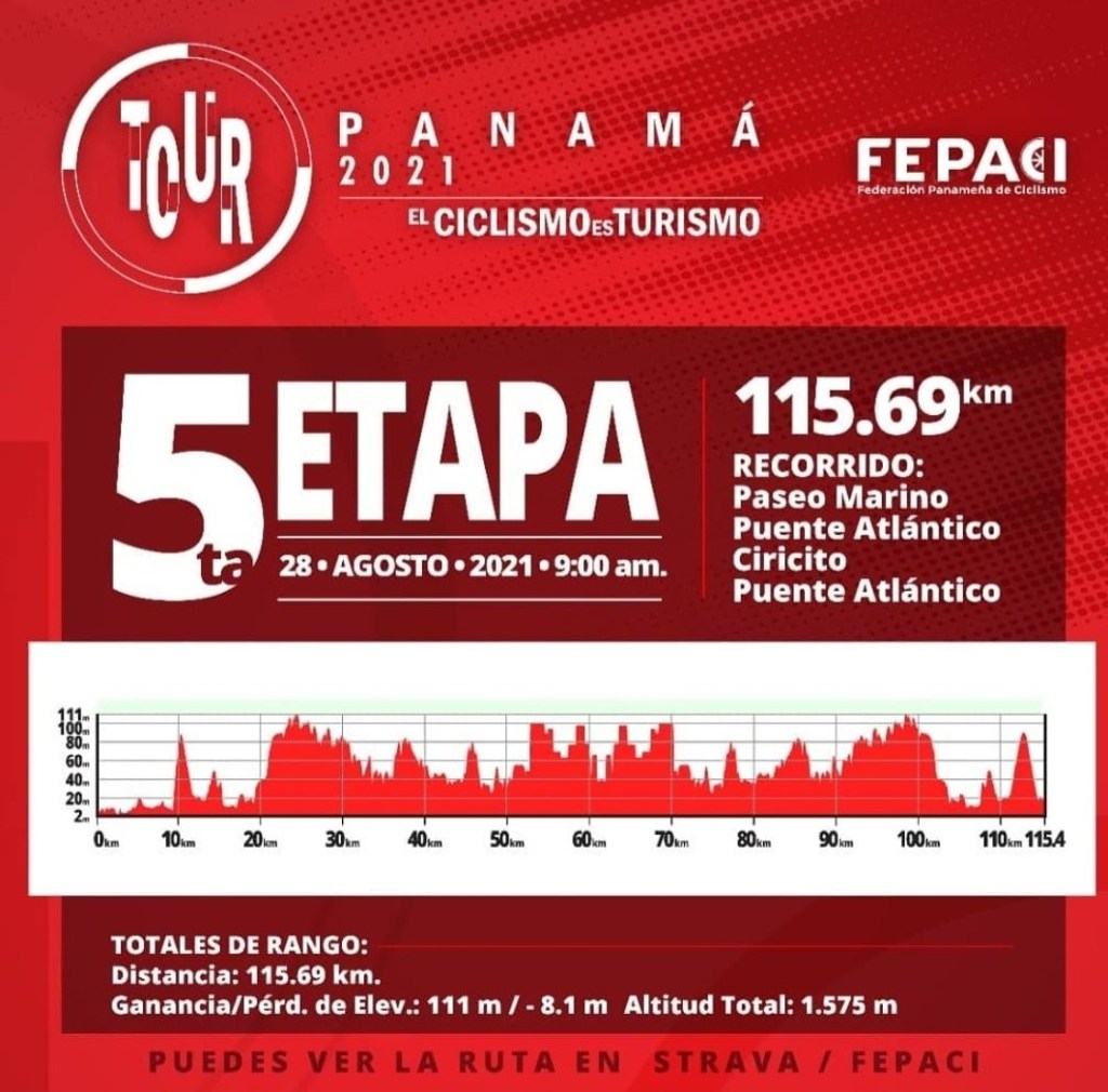 El sábado se disputa la quinta etapa de la Vuelta a Panamá. Saldrá del Paseo Marino de Colón y terminará en Puente Atlántico. Serán 115.7 kilómetros de recorrido.