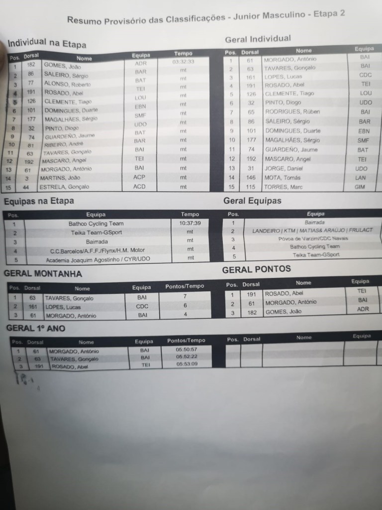 Con la llegada del pelotón compacto, Antonio Morgado (Bairrada) mantuvo el liderato de la competición y también el maillot blanco, como mejor júnior. Su compañero Gonçalo Tavares sigue siendo el líder de la montaña, con Abel Rosado con la camiseta de los puntos.