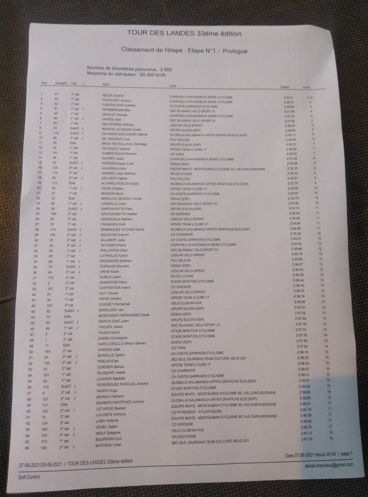 Quentin Bezza (Charvieu) ha sido el ganador de la primera etapa del Tour les Landes disputada en la modalidad contrarreloj individual sobre una distancia de 2 kilómetros en el centro de la ciudad de Dax. Ha comenzado en el Boulevard des Sports y finalizo en las Arènes de Dax. Su compañero de equipo Amaury Pacouret ha sido segundo y Aurélien Costeplane (Castelsarrasin). Puesto 15 para el corredor del Equipo Essax Kaden Luke Hopkins. Tomás Miralles ha ocupado la plaza 22.