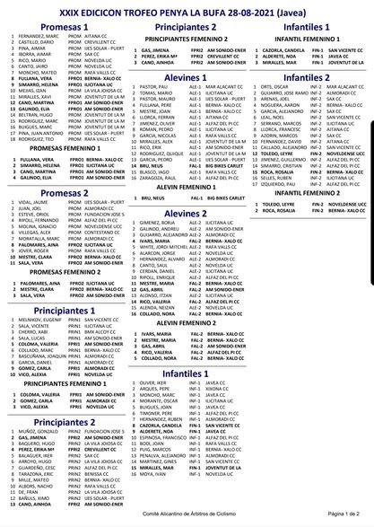 El CC Jávea ha sido profeta en su tierra y esta tarde se ha impuesto en el XXXIX Trofeo Peña La Bufa para Escuelas de Ciclismo. La prueba ha contado con 136 escolares pertenecientes a 23 clubes. La Unión Ciclista Ilicitana ha sido segunda y el Mar Alacant, tercero. A nivel personal, Marc Fernández (Aitana) y Vera Fullana (Bernia-Xaló) se han impuesto en Promesas 1; Jaume Vidal (Ijes Solar) y Aina Palomares (UC Ilicitana), en Promesas 2; Eugenif Melnikov (San Vicente) y Valeria Coloma (AM Sonido), en Principiantes 1; Gonzalo Muñoz (Fundación Sabater) y Jimena Gas (AM Sonido), en Principiantes 2; Pau Pastor (Mar Alacant) y Neus Bru (Big Bikes), en Alevines 1; Borja Giménez (UC Ilicitana) y María Ivars (Bernia-Xaló), en Alevines 2; Iker Oliver (Jávea) y Candela Cazorla (San Vicente), en Infantiles 1; y Óscar Orts (Mar Alacant) y Leyre Toledo (Noveldense), en Infantiles 2.