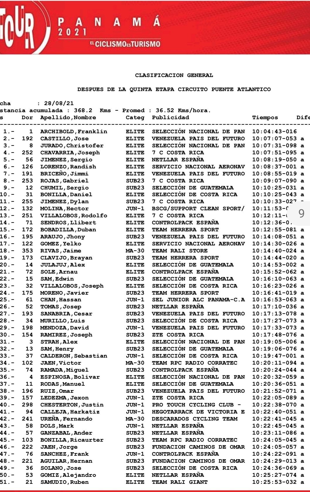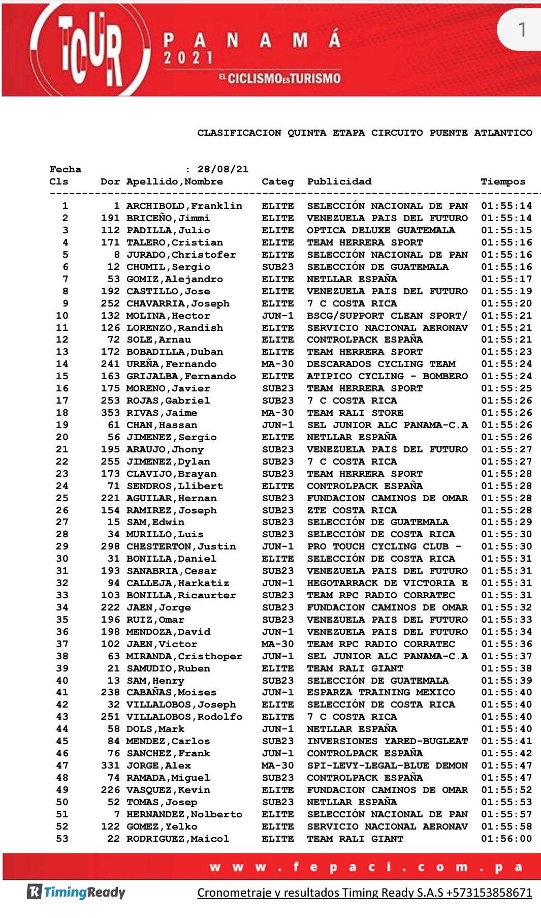 Suma y sigue. Franklin Archibold (Panamá) ha logrado su cuarta victoria consecutiva en el Tour de Panamá. Hoy se ha impuesto al esprint en la quinta etapa, en la que Alejandro Gómiz (Netllar Alé) ha sido séptimo. Su compañero Sergio Jiménez ha ocupado el puesto 20. En la categoría júnior, Marc Dolçs ha ocupado la plaza octava. El ganador ha hecho un tiempo de una hora, 55 minutos y 14 segundos.
