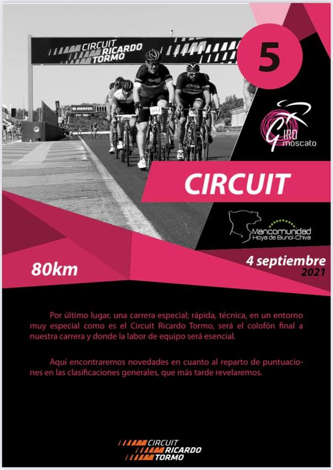 El Giro Moscato finalizará el sábado, día 4 de septiembre, a partir de las 17 horas. La prueba se desarrollará en el Circuito Ricardo Tormo. Se darán 20 vueltas hasta completar los 80 kilómetros previstos por la organización.