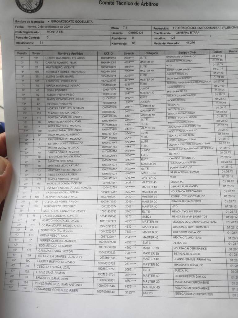 Eduardo Llacer (Grupeta de la Safor) ha sido el ganador de cuarta etapa del Giro Moscato que se ha disputado en Godelleta sobre una distancia de 60 kilómetros y final en un auténtico muro. Su tiempo ha sido de una hora, 27 minutos y 13 segundos. La prueba se ha desarrollado a una gran velocidad, a 41 kilómetros por hora, a pesar de tener mil metros de desnivel.