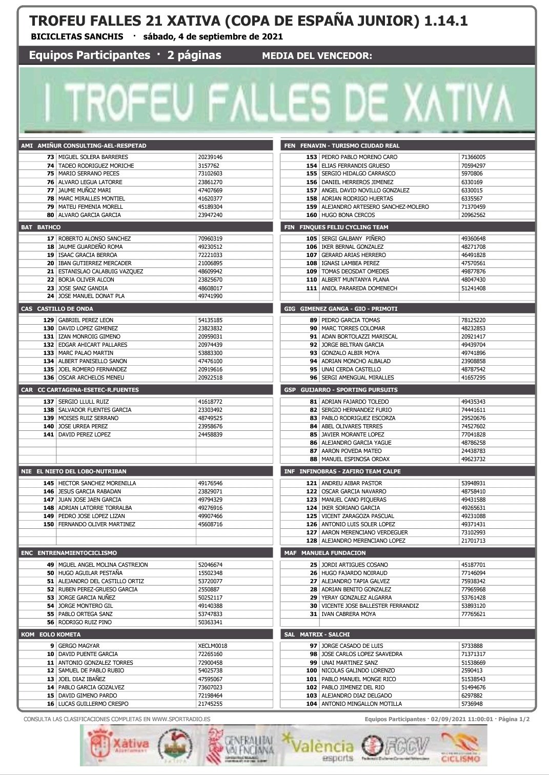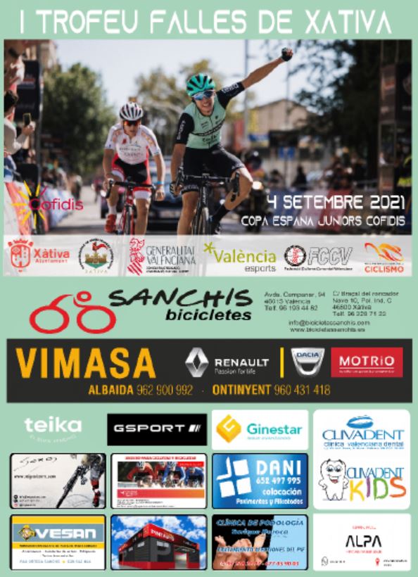 El sábado finaliza en Xàtiva la Copa de España Júnior Cofidis con la disputa del I Trofeu Falles de Xàtiva. A la localidad valenciana acudirán los tres equipos juveniles alicantinos Guijarro Sporting Pursuits, Infinobras Calpe y Giménez Ganga Gio Alicante Primoti, además de Raúl Mira (Teika), Jaume Guardeño (Bathco) y José Segura (Manuela Fundación). LISTA DE INSCRITOS