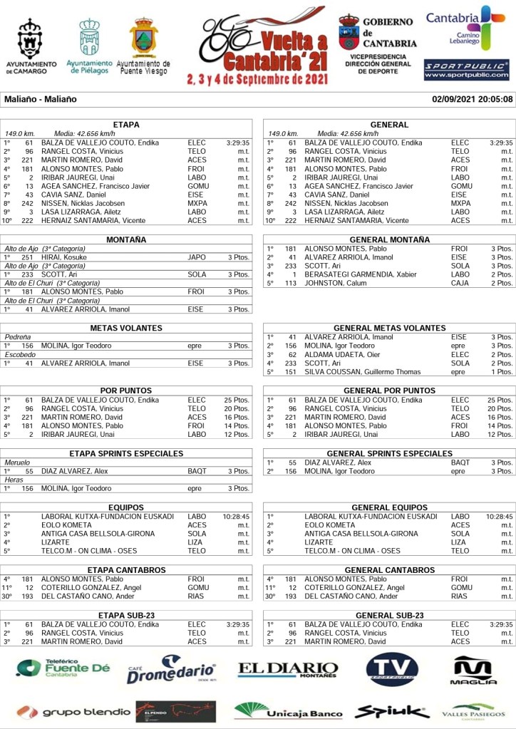 Pablo Alonso se ha vestido con el maillot de la montaña; Imanol Álvarez con el de las metas volantes; Alex Díaz, el de los sprints especiales; y el Laboral Kutxa ha sido el equipo.