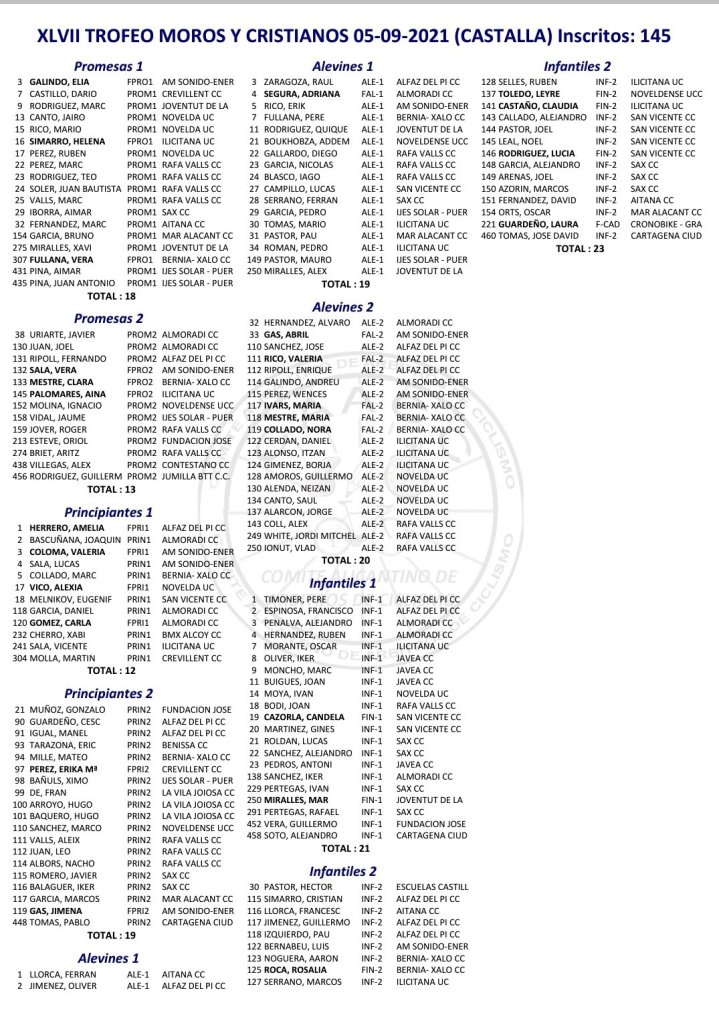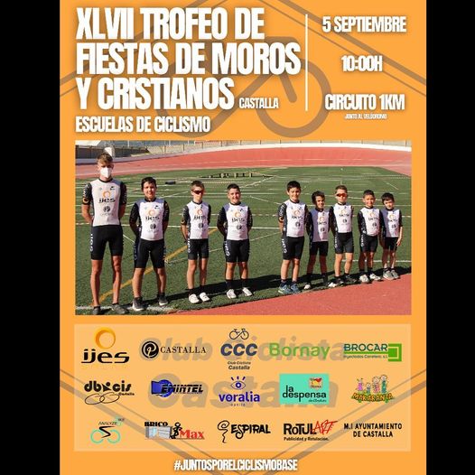 El domingo, día 5 de septiembre, a partir de las 10 horas, se disputa el XLVII Trofeo de Fiestas de Moros y Cristianos de Castalla para Escuelas de Ciclismo. Tras la ausencia por la pandemia el año pasado lo más pequeños tendrán la oportunidad de competir por las calles de la localidad alicantina. Se ha diseñado un circuito junto al circuito en la calle General Vicente Ripoll Valls. La prueba, en la que hay inscritos 145 ciclistas, está dirigida a los Promesas Masculino 2, Promesas Masculino 1, Promesas Femenino 2, Promesas Femenino 1, Principiantes Masculino 2, Principiantes Masculino 1, Principiantes Femenino 2, Principiantes Femenino 1, Infantil Masculino 2, Infantil Masculino 1, Infantil Femenino 2, Infantil Femenino 1, Escuelas, Cadete Fem., Alevín Masculino 2, Alevín Masculino 1, Alevín Femenino 2, Alevín Femenino 1 y Adaptado.