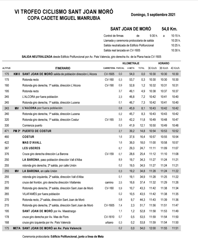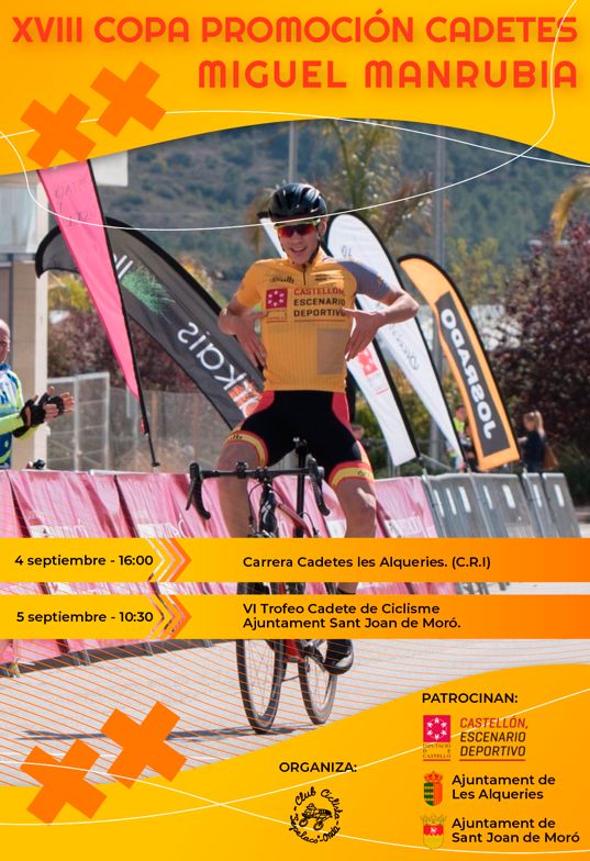 Este fin de semana se disputa la XVIII Copa Promoción Miguel Manrubia con la presencia de los equipos alicantinos Zafiro Team, Giménez Ganga, Grupo Sime y GD Llopis. La primera etapa será una contrarreloj individual de 6,85 kilómetros en Alqueríes del Niño Perdido que tendrá lugar el sábado. La salida del primer corredor se dará a las 16 horas. Ya el domingo, la cita será en Sant Joan de Moró. Con partida a las 10.30 horas, el pelotón deberá recorrer 54 kilómetros.