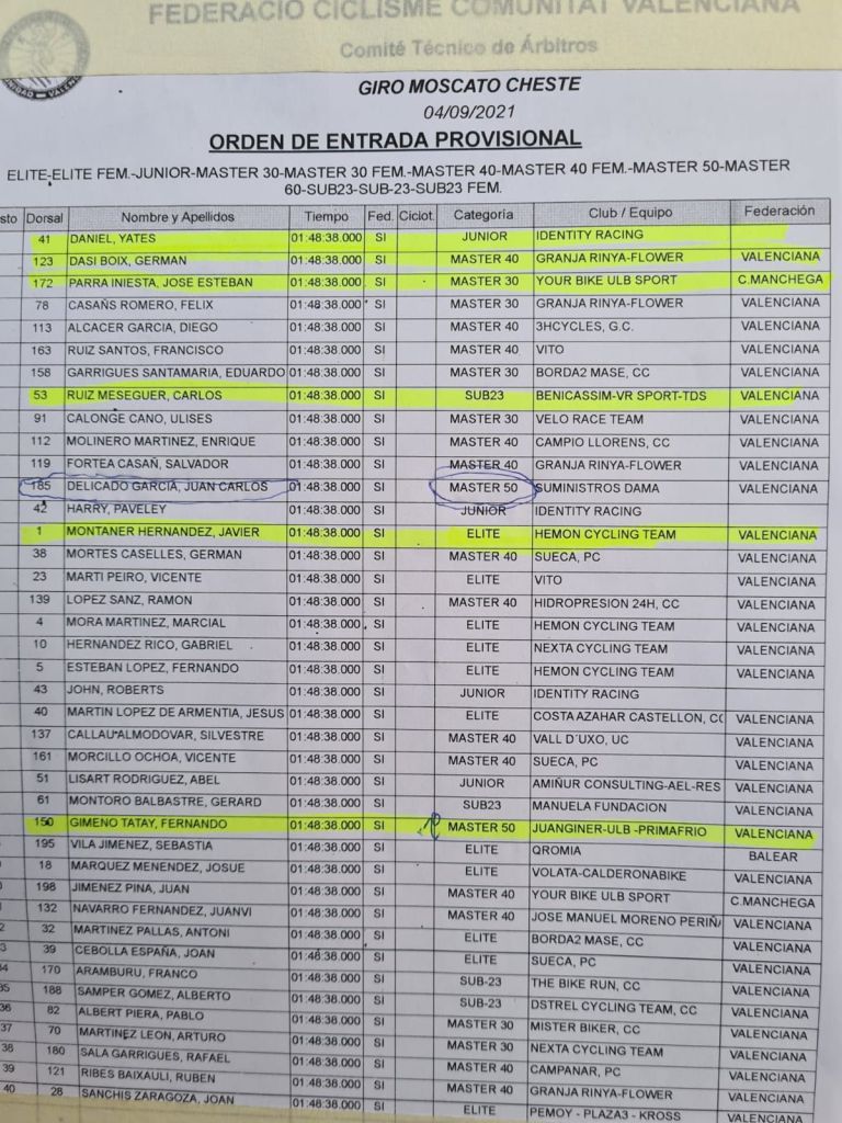 Daniel Yates (Identity Racing) se ha impuesto hoy en la quinta y última etapa del Giro Moscato que se ha disputado en el Circuito Ricardo Tormo. Se han dado 20 vueltas hasta completar los 80 kilómetros previstos. El ganador ha estado acompañado en el podio de la jornada por Germán Dasi (Granja Rinya) y José Esteban Parra (Your Bike). Félix Casañs, que hoy ha sido cuarto, se ha proclamado vencedor de la general final por delante de Vicente Martí y John Roberts. Éxito organizativo en esta primera edición que ha contado con cinco etapas. Ya falta menos para la siguiente.
