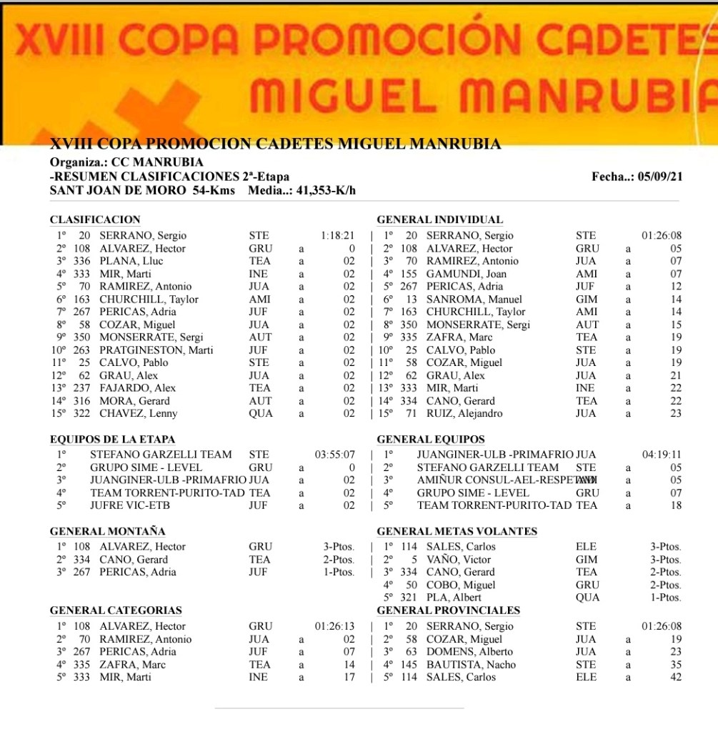 En la general, Sergio Serrano ha sido el vencedor, con cinco segundos de ventaja sobre Héctor Álvarez y siete sobre Antonio Ramírez (JuanGiner). Álvarez ha sido el primer cadete de primer año y se ha llevado el maillot de la montaña. Manuel Sanroma ha terminado sexto.