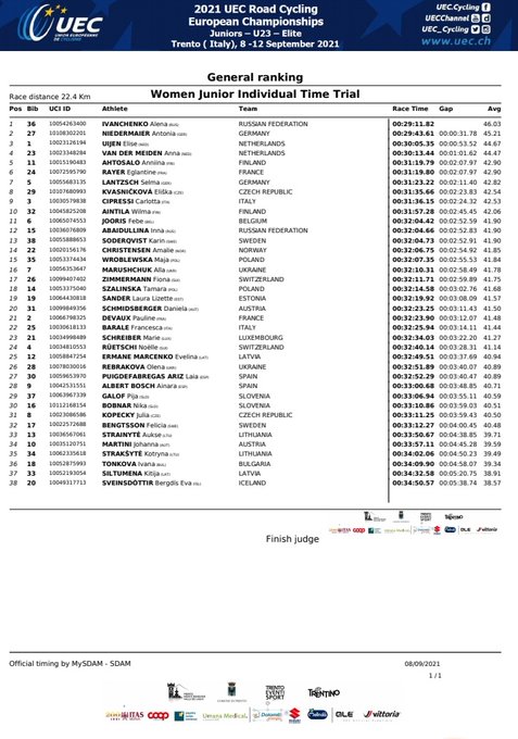 Alena Ivanchenko se ha proclamado esta mañana en Trento campeona de Europa júnior femenina de contrarreloj. La corredora rusa, de solo 17 años, fue con mucho la más rápida después de 22,4 kilómetros de recorrido llano. La alemana Antonia Niedermaier se llevó la plata, mientras que Elise Uijen ganó el bronce por parte de Holanda. La valenciana Ainara Albert ha terminado en el puesto 28 y su compañera de selección Laia Puigdefabregas en el 27.