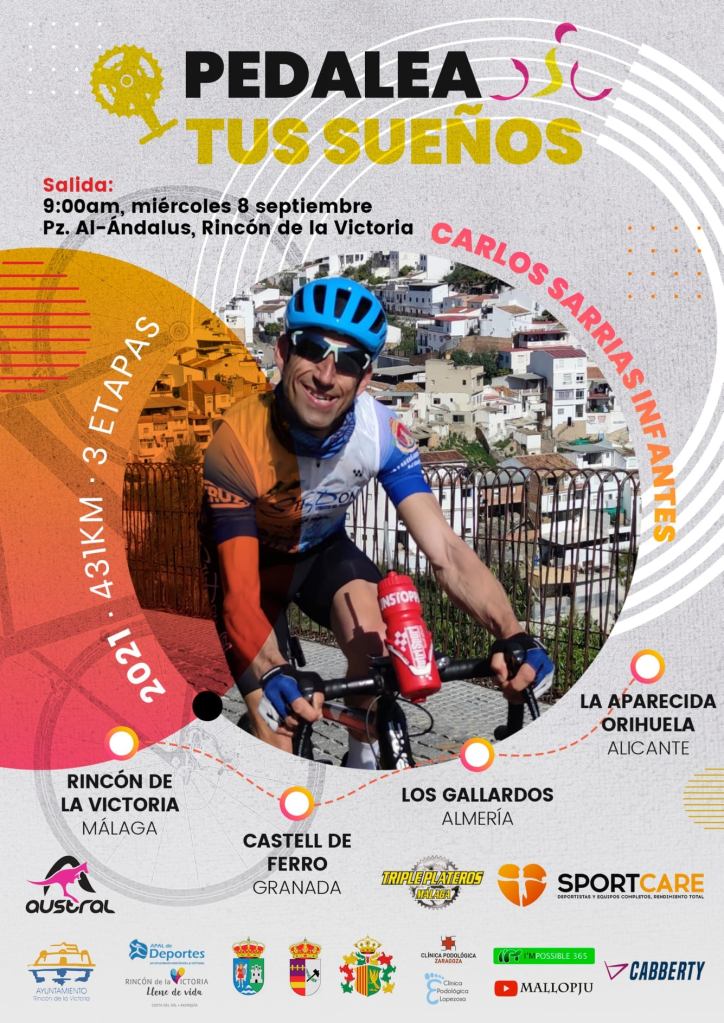 «Pedalea tus sueños 2021» ha comenzado esta mañana desde la plaza Al-Ándalus, en el Rincón de la Victoria de Málaga. El deportista de ciclismo adaptado oriolano Carlos Sarrías Infantes, junto a un pequeño equipo de corredores y apoyo logístico, ha puesto rumbo a La Aparecida, en Orihuela. El recorrido, que abarca 431 kilómetros, se ha iniciado en su lugar de residencia y finalizará en la plaza del pueblo donde creció.