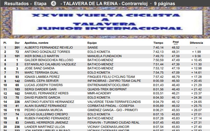 Alberto Fernández (Sanse) ha sido el ganador del segundo sector de la cuarta etapa de la Vuelta a Talavera, una CRI de 6,2 kilómetros. Ha parado el reloj en los 7 minutos y 40 segundos. Antonio González (Eolo) ha sido segundo e Iker Bonillo (Manuel Fundación), tercero. Dani Cepa (Infinobras) ha firmado una meritoria novena plaza. Antonio González (Eolo) es el nuevo líder a falta de una jornada para el final. Lucas Joseph Towers (Entrenamiento Ciclismo) va segundo y Alain Suárez (Corbatas Pindal), tercero. Abel Olivares (Guijarro) lidera el premio de las metas volantes y su compañero Adrián Fajardo es el primer clasificado de Castilla La Mancha.