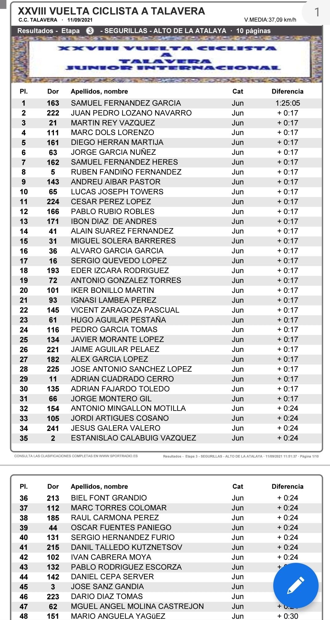 Samuel Fernández ha sido el ganador del primer de la tercera etapa de la Vuelta Ciclista a Talavera Júnior disputada entre Segurilla y el Alto de La Atalaya. Ha recorrido los 52,6 kilómetros de la jornada en una hora, 25 minutos y tres segundos. A 17», dando tiempo al pelotón, ha entrado Juan Pedro Lozano. Martín Rey ha sido tercero y Marc Dolçs (Giménez Ganga), tercero. Andreu Aibar (Infinobras) ha ocupado la novena plaza y Abel Olivares (Guijarro Sporting Pursuits) sigue liderando el premio de las metas volantes. Rubén Fandiño sigue de líder. Esta tarde se disputa el segundo sector en Talavera, una CRI de 6,2 kilómetros.