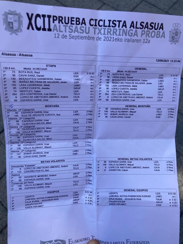 La prueba navarra se ha disputado a gran velocidad y en ella se han dado varias escapadas que no han terminado de cuajar para que al final se haya disputado la victoria en un sprint reducido de unidades en el que Rota ha salido vencedor.