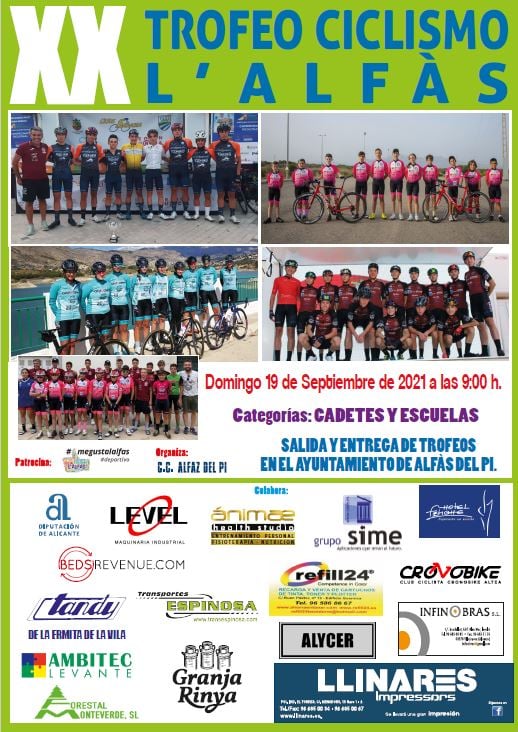 Alfaz del Pi y Alicante cierran la competición de Escuelas de Ciclismo de la Provincia que comenzó el 15 de mayo en Polop y que ha contado hasta ahora con 14 pruebas. El próximo domingo, día 19 de septiembre, se celebra el « XX TROFEO ESCUELAS DE CICLISMO L’ALFAS» en un circuito habilitado en la localidad alicantina para dicha competición. A las 10:15 empezarán las escuelas con la disputa de una gymkana y las categorías de Promesas que darán media vuelta al circuito. Los corredores de categoría Principiantes darán una vuelta; los Alevines de primer año competirán dando 4 vueltas; los Alevines de segundo año , 5 vueltas; los ciclistas de categoría Infantil de primer año darán 8 vueltas y los infantiles de segundo diez. La prueba estará organizada por el Club Ciclista l’Alfás del Pi, con la colaboración de la Concejalía de Deportes, Proteción Civil y Policía Local.