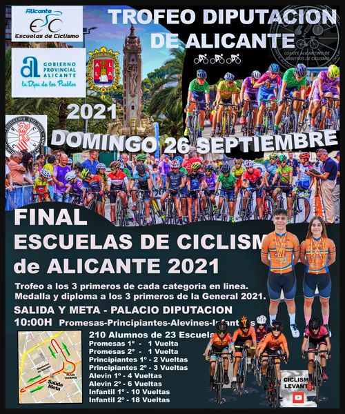 El domingo, 26 de septiembre, a partir de las 10 horas, se pone el punto y final a la competición de Escuelas de Ciclismo de Alicante con el Trofeo Diputación, que también será puntuable. Al termino de la mismo se darán las medallas y diplomas de la temporada 2021. Han sido 210 alumnos de Alicante repartidos en 23 Escuelas las que han participado a lo largo de la temporada.