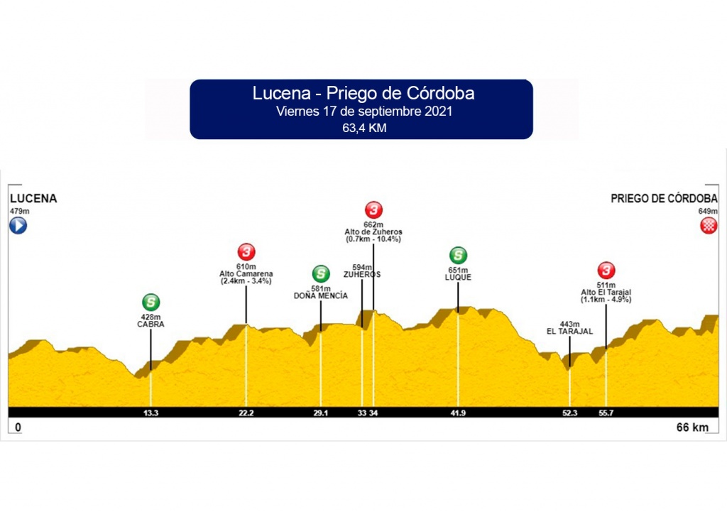 Salida de Lucena, pasos por Cabra, Doña Mencía, Zuheros, Luque, Fuente Alhama, El Tarajal y meta en Priego de Córdoba.