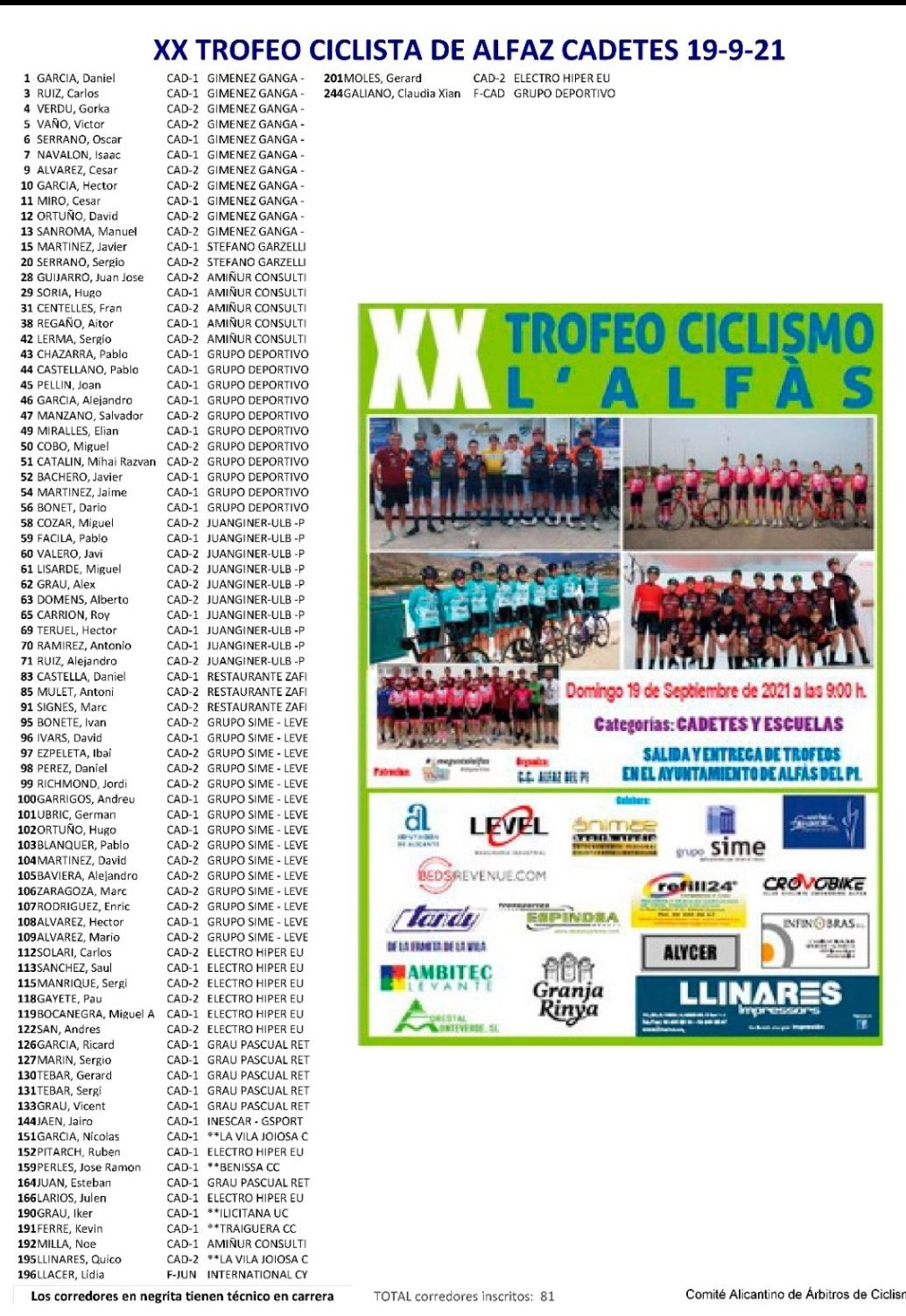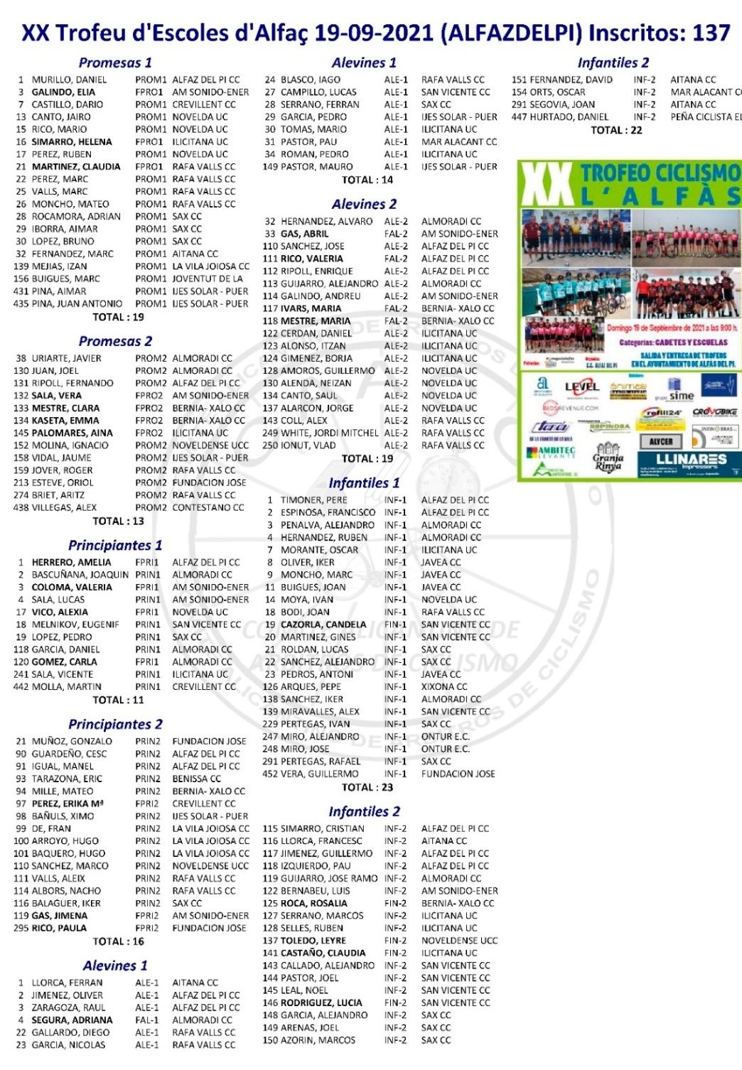 Alfaz del Pi reúne el domingo a 81 ciclistas cadetes y 137 escolares en el “ XX TROFEO ESCUELAS DE CICLISMO L’ALFAS” que se disputará en un circuito habilitado en la localidad alicantina para dicha competición. Los cadetes comenzarán su participación a las nueves con la presencia de los equipos alicantinos Grupo Sime, Giménez Ganga y GD Llopis. A las 10:15 empezarán las escuelas con la disputa de una gymkana y las categorías de Promesas que darán media vuelta al circuito. Los corredores de categoría Principiantes darán una vuelta; los Alevines de primer año competirán dando 4 vueltas; los Alevines de segundo año , 5 vueltas; los ciclistas de categoría Infantil de primer año darán 8 vueltas y los infantiles de segundo diez. La prueba estará organizada por el Club Ciclista l’Alfás del Pi, con la colaboración de la Concejalía de Deportes, Proteción Civil y Policía Local.