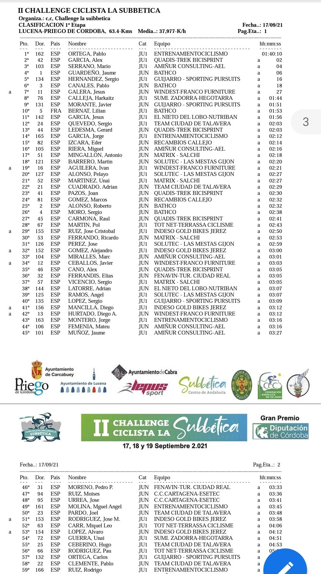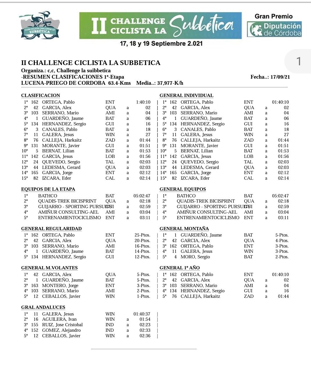Pablo Ortega (EntrenamientoCiclismo) ha sido el ganador de la primera etapa de la Challenge Ciclista de la Subbética-Gran Premio Diputación de Córdoba. Tras superar los 66 kilómetros que unen Lucena y Priego de Córdoba el vencedor ha parado el reloj en la hora, 40 minutos y 10 segundos. A dos segundos ha entrado Álex García (Quadis); a cuatro, Mario Serrano (Amiñur); a seis lo ha hecho el alteano Jaume Guardeño (Bathco); y a 16, el ilicitano Sergio Hernández (Guijarro). Su compañero de equipo, Javi Morante, ha sido noveno. Por equipos, el juvenil del Club Ciclista San Vicente ha terminano tercero. Jaume Guardeño es el líder de la montaña y es segundo en las metas volantes.