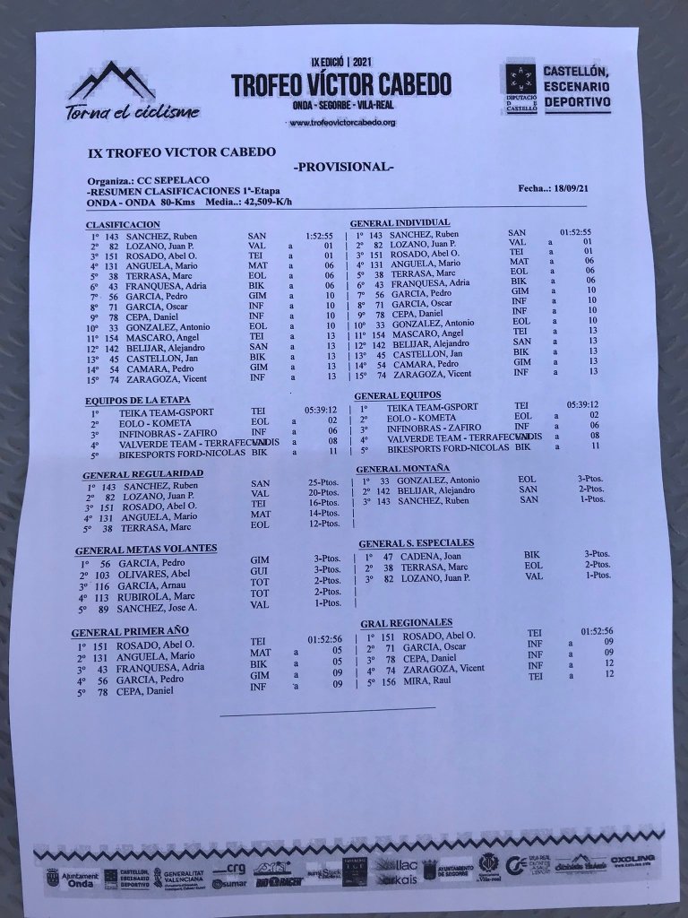 Victoria de Rubén Sánchez (Sanse) en el Trofeo Castillo de Onda, primera prueba del Trofeo Cabedo. Pedro García (Giménez Ganga) ha sido séptimo; Óscar García (Infinobras), octavo; Daniel Cepa (Infinobras), noveno;y Pedro Cámara (Giménez Ganga), 14.